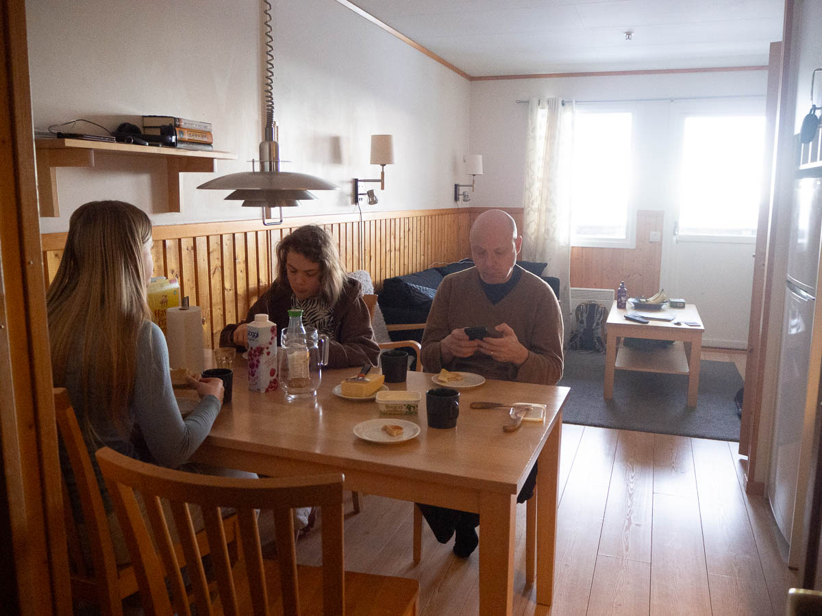 Off for a half-week of skiing in Stöten. Today was mostly a day of driving, and then getting ourselves situated, picking up our skis, etc. I forgot to take a photo, so I’m borrowing this one from tomorrow morning. This is our small apartment in Stöten – a small kitchen/living room combo, and two small bedrooms with bunk beds. It’s OK, for a few days, but with last year’s stay in Kläppen fresh in our memories, this doesn’t really compare. The sofa in particular is uncomfortable no matter how we try to sit in it. But! We’re no more 50 metres from the nearest piste, which is worth quite a bit.