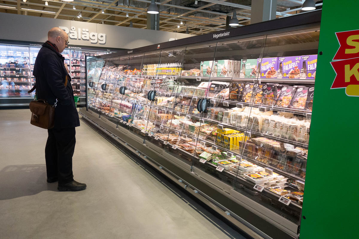 Large, spacious, and well stocked, and with a wider range of most things than “our” Coop. More exotic vegetables, and funky mushrooms. And this fridge, of like, 10 metres, is filled from edge to edge with just vegetarian products – tofu and falafel and meatless burgers and vegan cheese and so on. Nice.