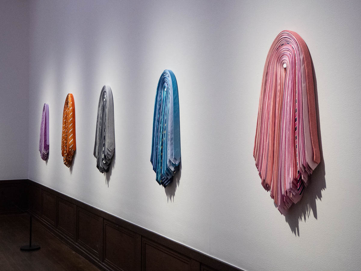 Yet other works sparked different kinds of questions. These five colour-coordinated stacks of men’s ties, seemingly just hung over a hook. How did they transport this work? Probably in parts. Who hung it up again? How did they ensure the ties were hung in the right order, and with acceptable (lack of) precision?