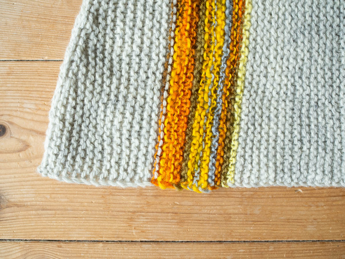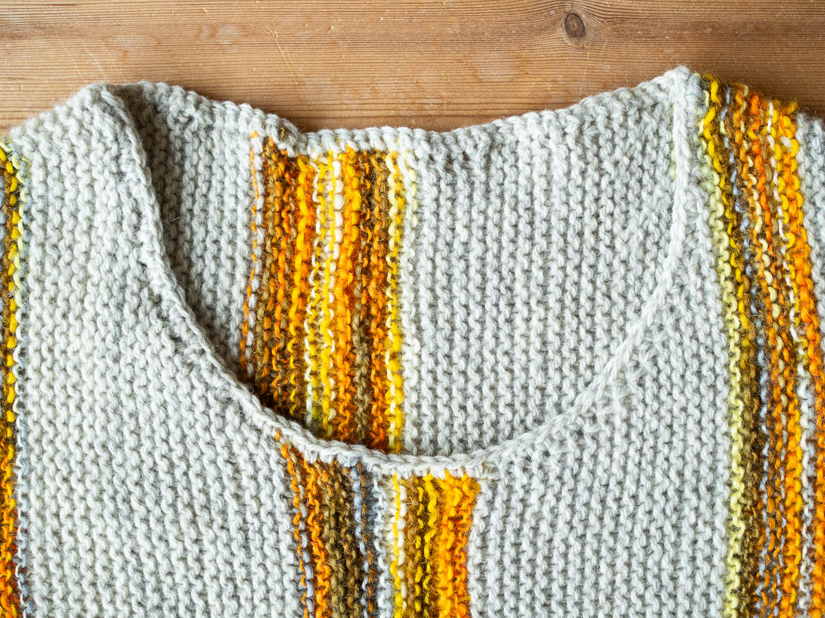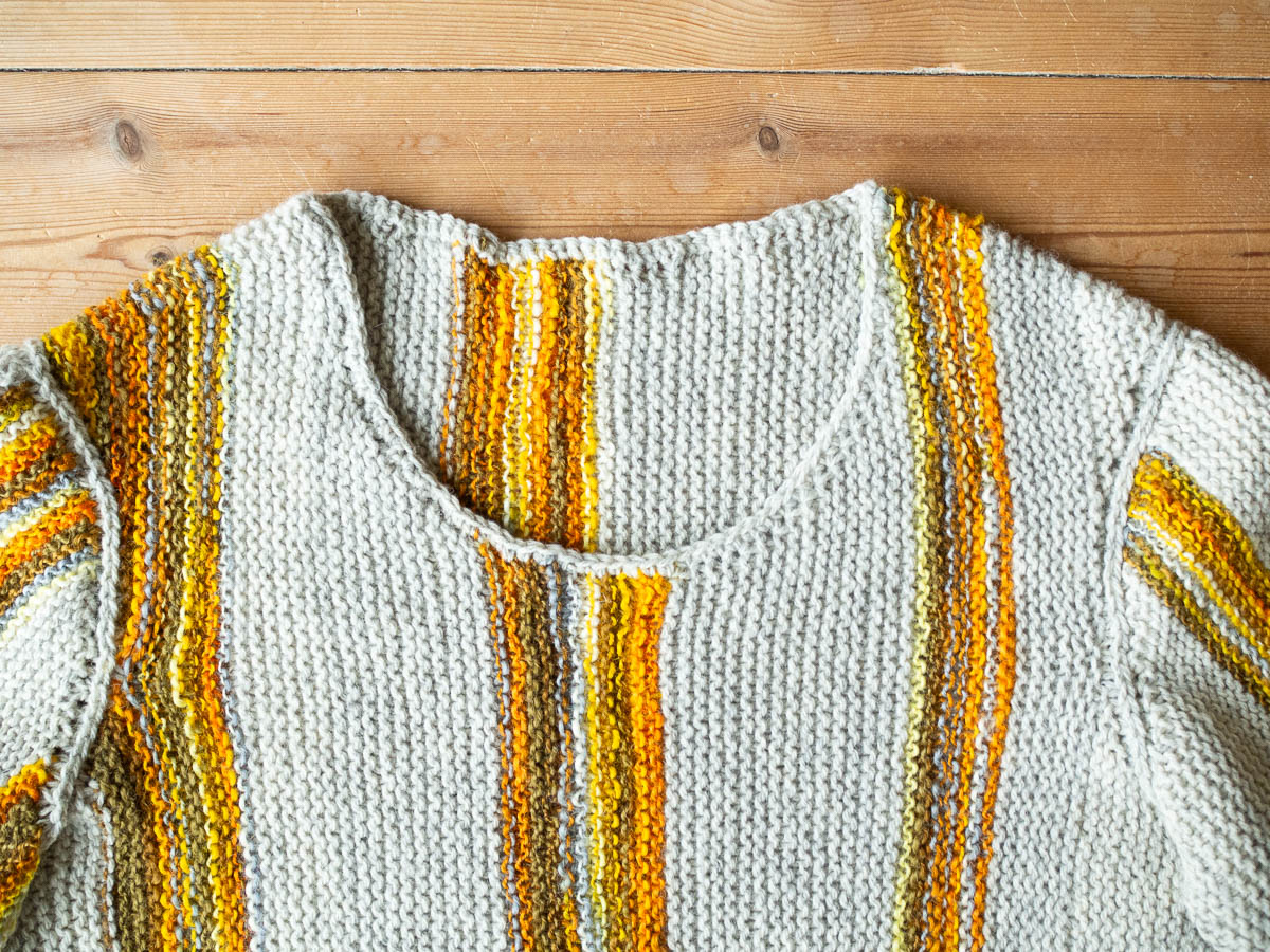 It didn’t come out quite as I had pictured it. The stripes could have been more uneven in width and distribution. Now I just eyeballed things, and clearly ended up converging at some kind of comfortable width and comfortable distance. Also, I had imagined a more drapey look, but the garter stitch made the fabric a bit stiff.
