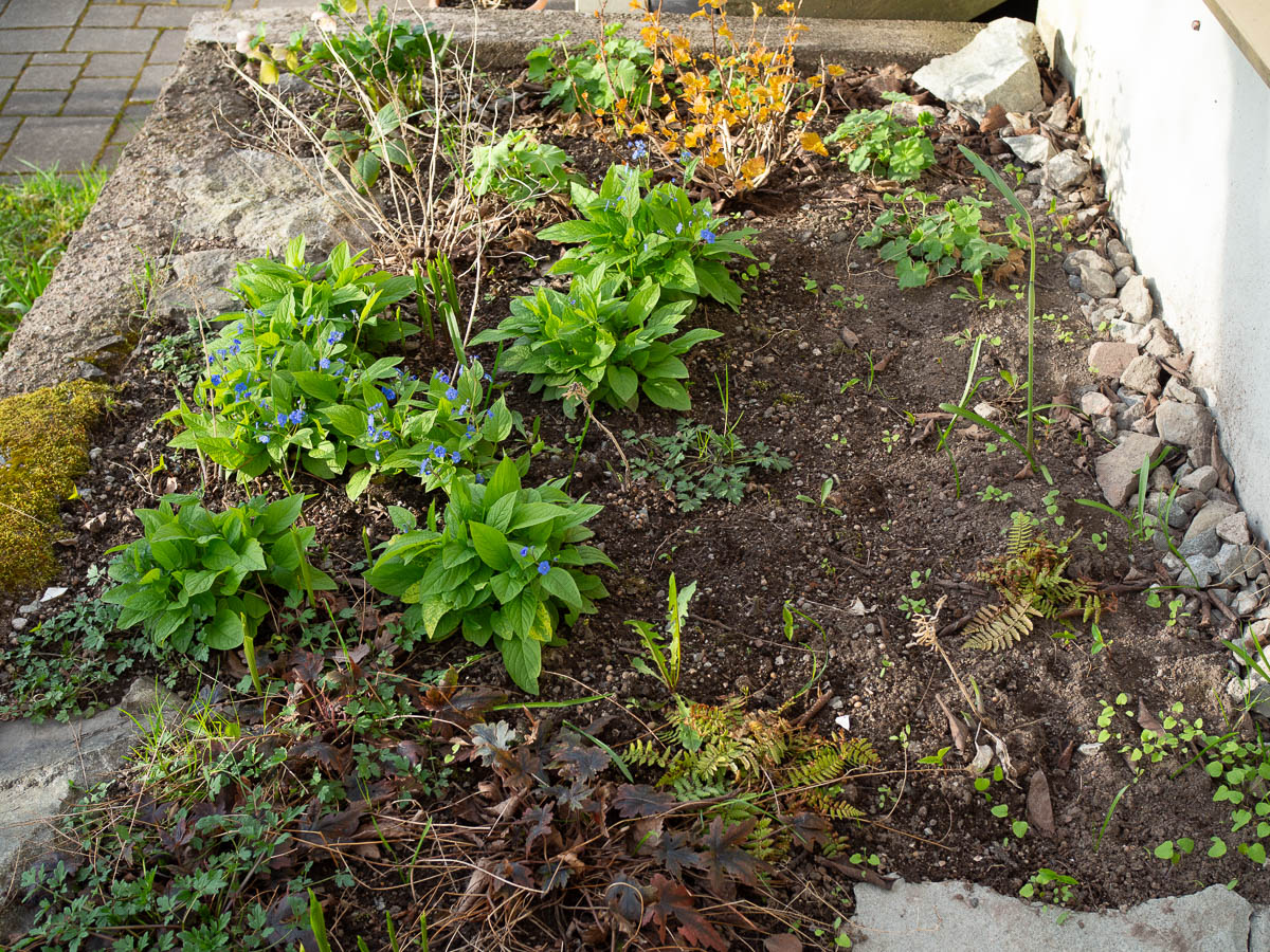 The planting in the corner in front of the house is delivering mixed results, which is pretty much as expected. The Omphalodes and Alchemilla are growing well, like the Helleborus that I’ve photographed before. The funkias, lilies of the valley and Tiarellas are slower to come up, but are present and accounted for.