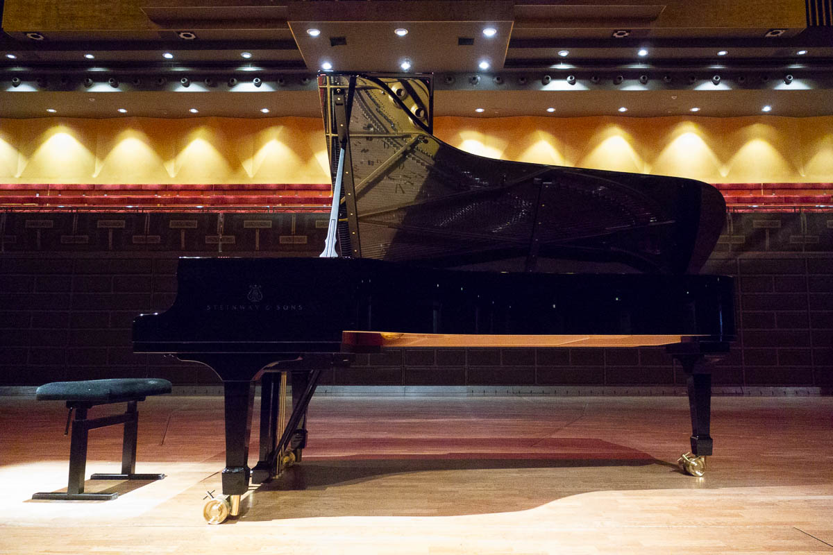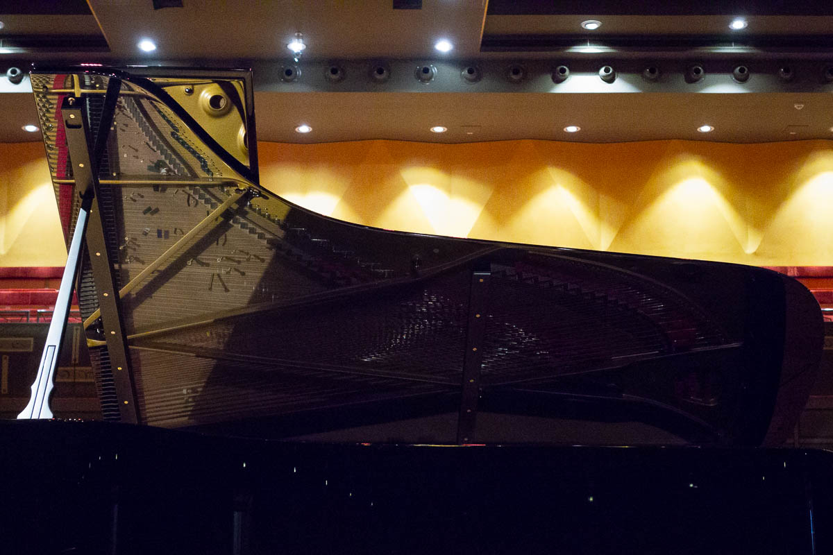 I asked if I could step up on the stage to see the prepared piano up close, but the staff clearly just wanted the audience to be gone so they could clean up and go home, so I had to make do with photos of the strings and objects as reflected in the lid of the piano, from a distance.