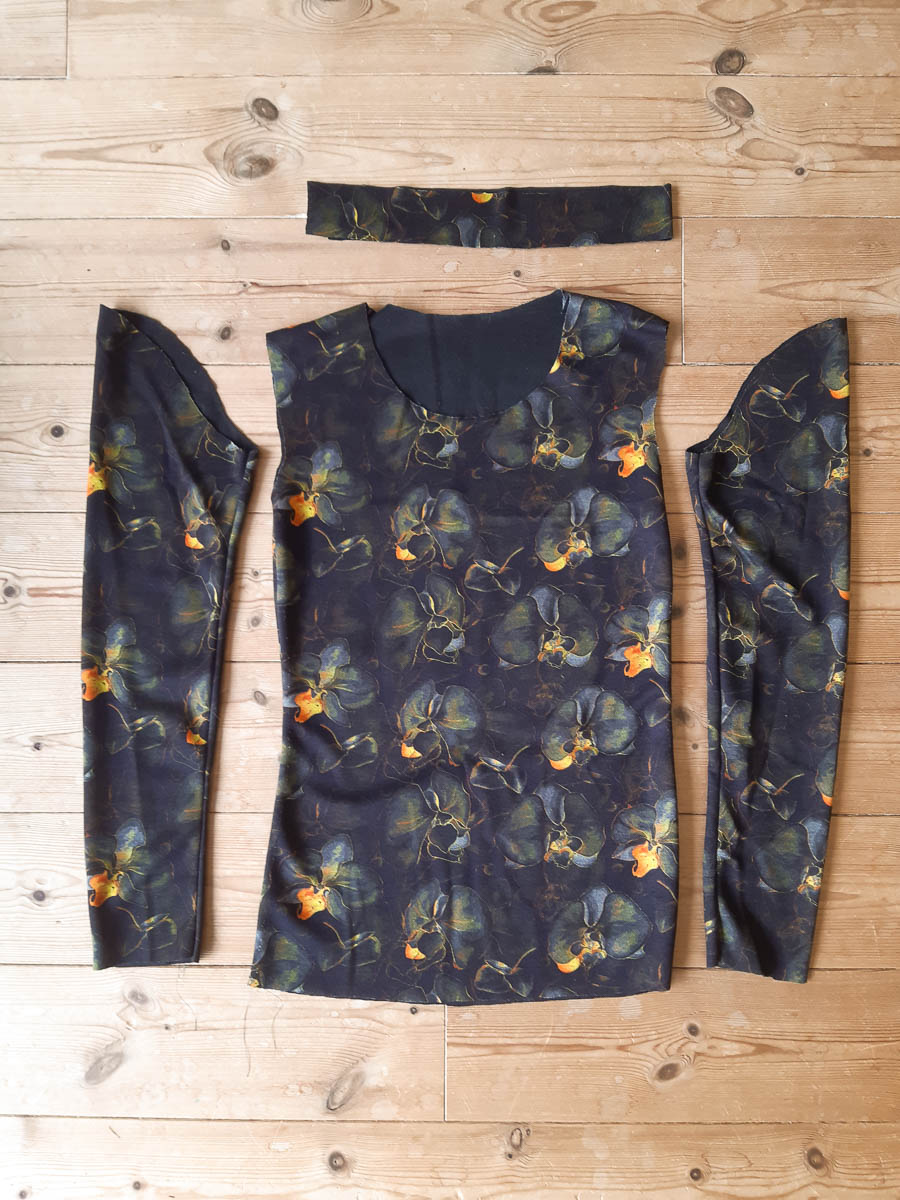 That’s a bit sad, but OK, I’ll make an ordinary long-sleeve top from a pattern I’ve used before. Cut out the pieces, start assembling. Top does not fit because the fabric has less stretch than the jerseys I’ve used before.