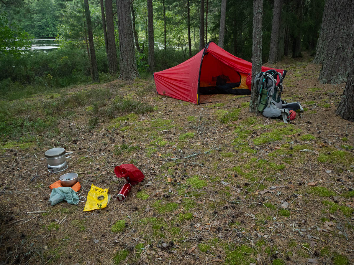 Due to my late start, and my slow pace because of the uneven path, I was worried about getting to the end at a reasonable hour. It was seven in the evening by the time I reached the camping area. I had been keeping my eyes open for the last kilometre or two of walking, for alternative camping spots in case the end of the stage was underwhelming (because the other end was literally a gravel parking lot!) but the area around Bruksdammen was beautiful. I put off all thoughts about cooking dinner and getting my tent set up, and instead admired and photographed the area. It was a wetland area with pink water-lilies in deep dark ponds.