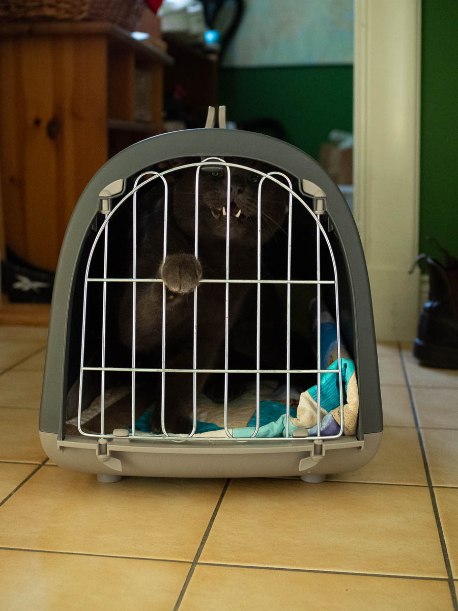 It’s time for Nysse’s annual vaccinations. He was not happy about being in the transport cage. Other cats at the clinic were just quietly sitting in theirs, while Nysse was yowling and trying to claw and bite his way though the bars.