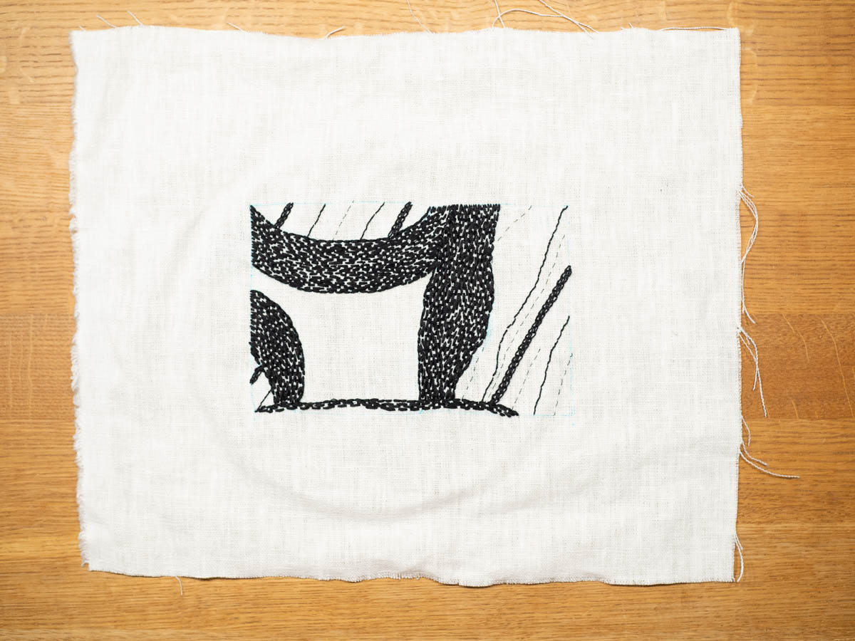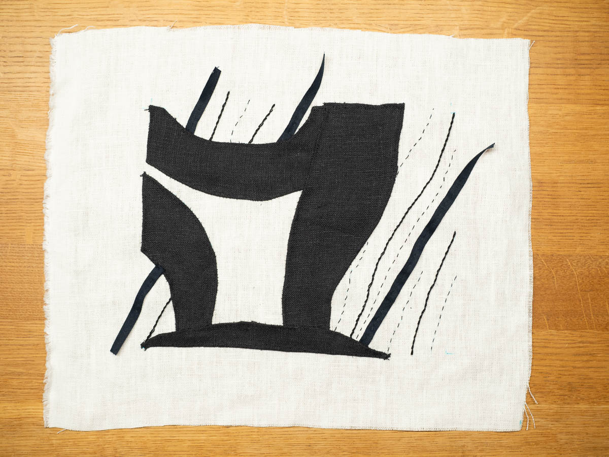 I didn’t want the downscaling to be just a straight-up copy, because where is the fun in that, so I stitched the black areas instead of using appliquĂ©. I kind of like it because the surfaces now have both structure as well as a flow and a direction. But I also don’t like it because the speckled look does not have the same impact at all as the unbroken black.