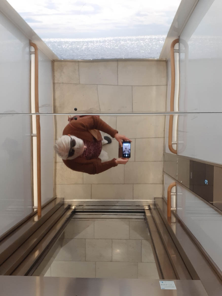 I just noticed that the lifts in the Waterfront building have mirror-blank ceilings. Not glass, though, because the reflections are slightly distorted.