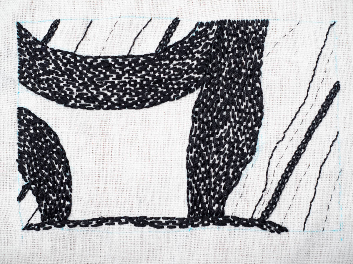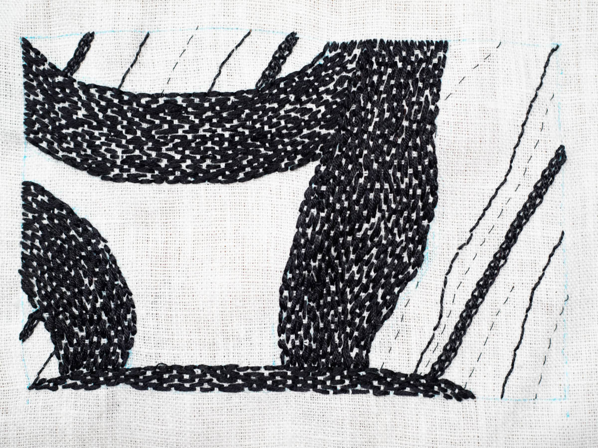 I wasn’t entirely satisfied with my last exercise for the black and white embroidery course. I touched up the shapes to make the proportions better, and that helped. The difference is perhaps subtle in a photo but obvious when I hold the piece in front of me.