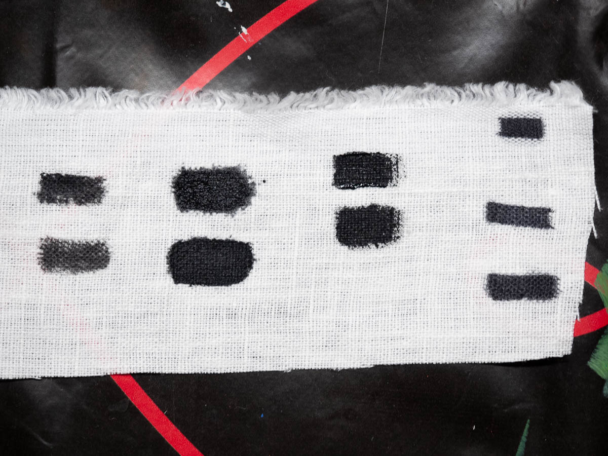 Had I planned for this, I could have painted those parts of the fabric before embroidering. Now I’ll have to do it after. I don’t have black fabric paint but I do have black acrylic. I’m now experimenting with watered-down acrylic paint to see how it affects the look and feel of the fabric.