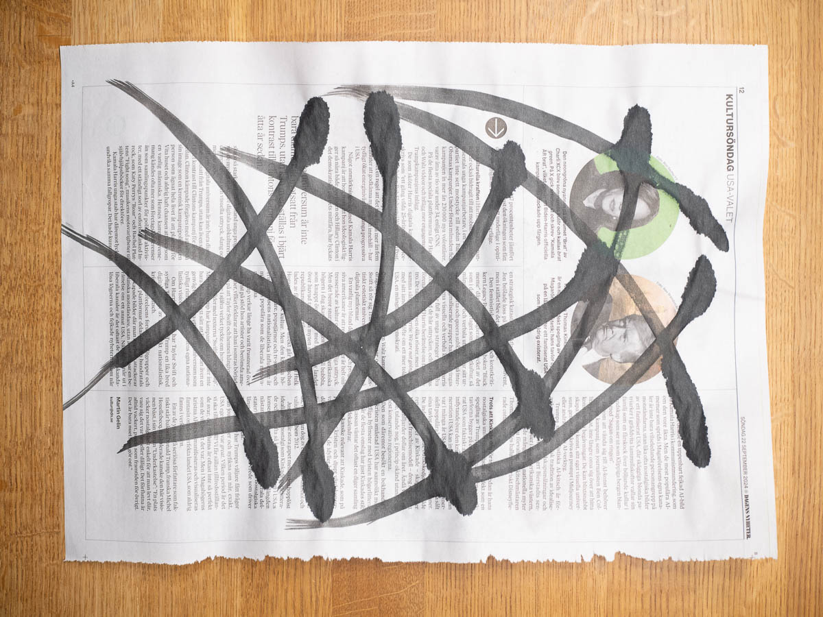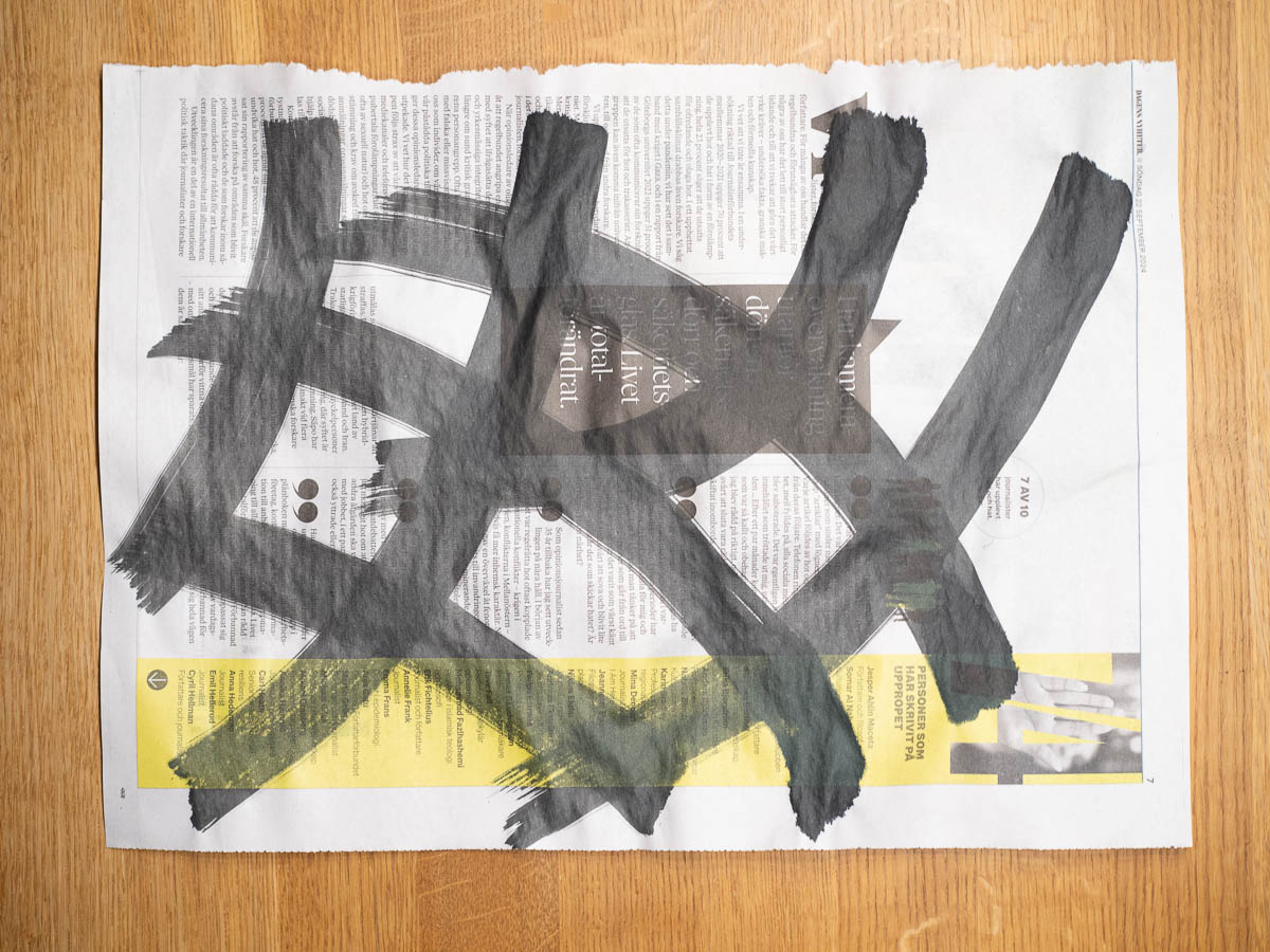Speaking of paint, our second exercise is to paint on newsprint with Indian ink and use that as a starting point for our embroidery design. I don’t think I’ve ever worked with Indian ink. One immediate learning is just how much the brush matters for this. I had one broad, thick, stiff brush and one smaller one, much softer. The thick brush held on to the ink and gave me even, smooth strokes. The soft brush gave up most of its load of paint as soon as it met paper, then ran out of ink before I even finished the stroke, and the brushstrokes came out as blobs with tails. Both brushes are from the same main street hobby store, so I guess it’s not even a matter of quality but just type of brush.