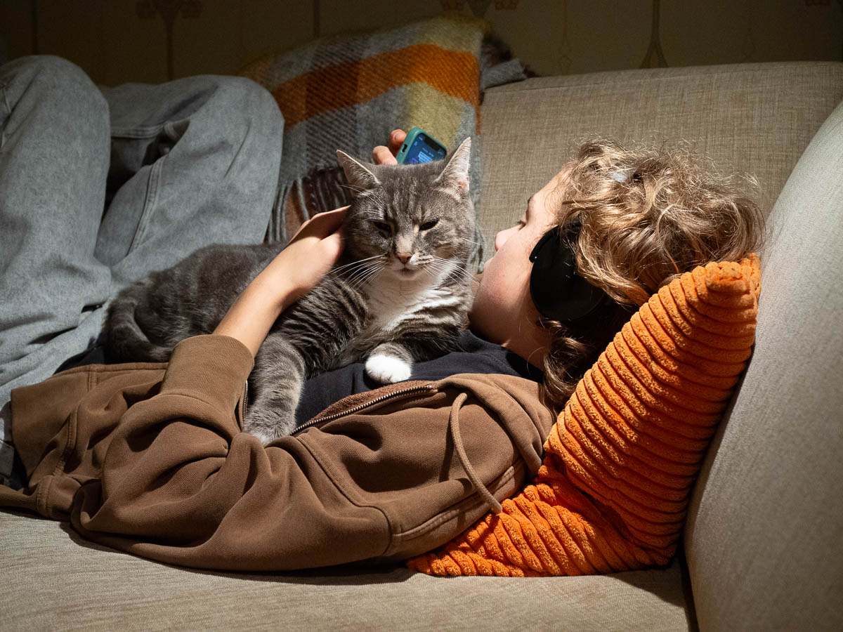 He did start by checking the food bowl, but then walked towards the sofa with a very goal-oriented mien, jumped up, and settled on Adrian’s chest. He stayed upright and alert for a while, but actually relaxed enough to lie down after some time.