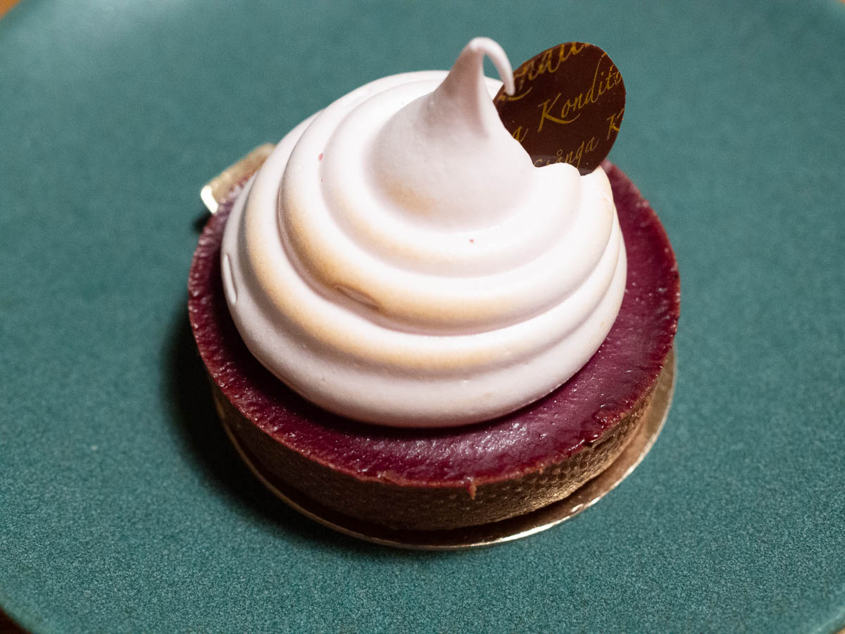 In the evening Ingrid came home with tartelettes from the bakery where she works. A thin, crumbly crust; blackcurrant curd; Italian merengue with a delicate raspberry flavour. A flavour explosion in every bite. This is what a cake should be like.