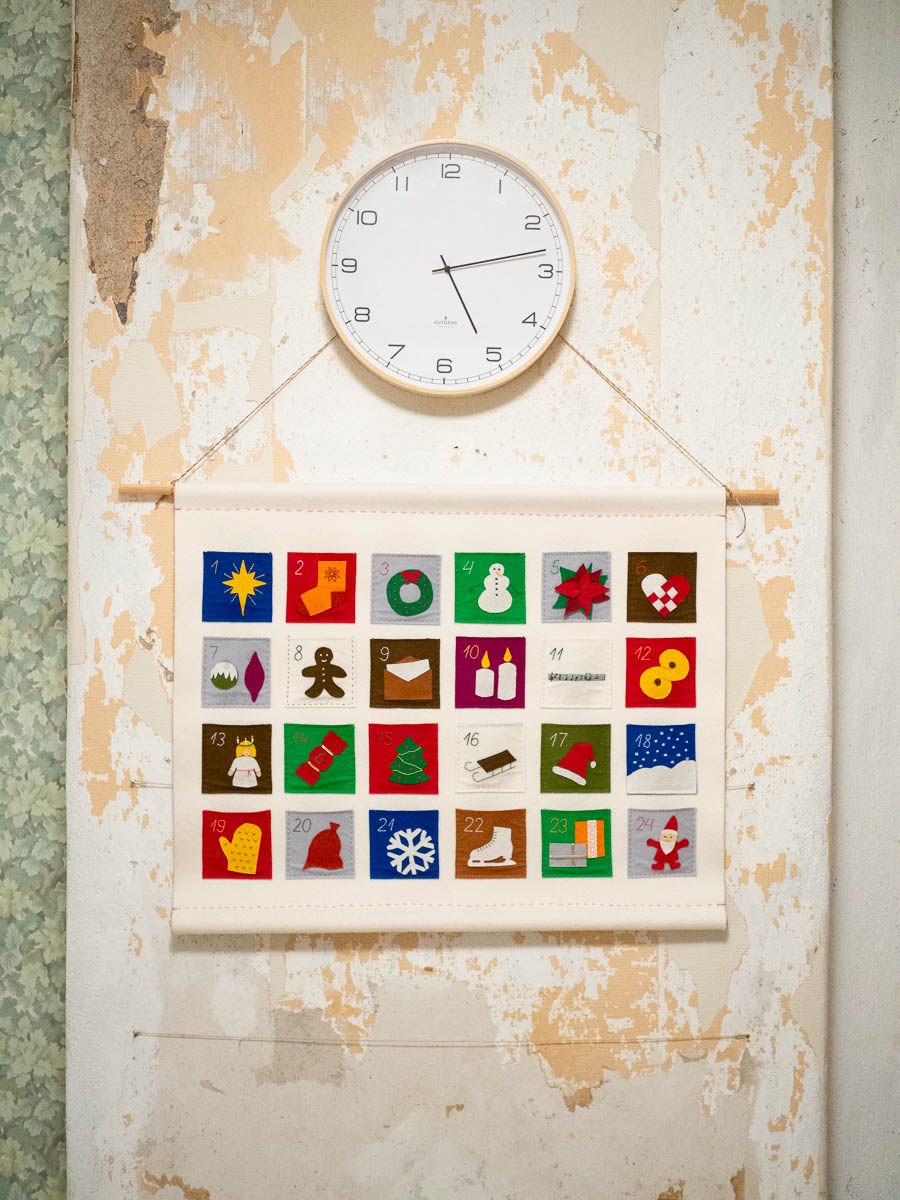 I’ve struggled to find a good place for the calendar in the past, especially with Nysse around. This year, after we’ve moved some furniture, I could hang it high up on the chimney wall. Well out of reach for the cat, well in reach for Adrian.