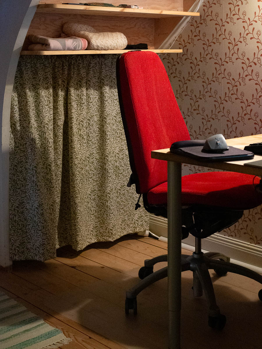 I needed a chair for the work nook, so I went to Blocket. Black chair, black chair, gray chair, black chair… boring, boring, boring… red! And the seller thought the red colour to be a potential problem. “Säljer en riktigt skön stol, som i färgen kanske inte är alla i smaken, men den är fantastisk på alla sätt o vis!” – “Selling a very comfy chair that might not be to everybody’s taste when it comes to colour, but it’s fantastic in all ways!” I’m glad that I like colour when everybody’s tastes lean towards black. This chair had been for sale for a month and a half, and nobody wanted it. It’s an RH Logic chair that cost around 15 000 SEK when new, and I got it for 600 – because the fabric is red and, to be fair, slightly faded along the front edge. Such a beauty, and such a great deal.