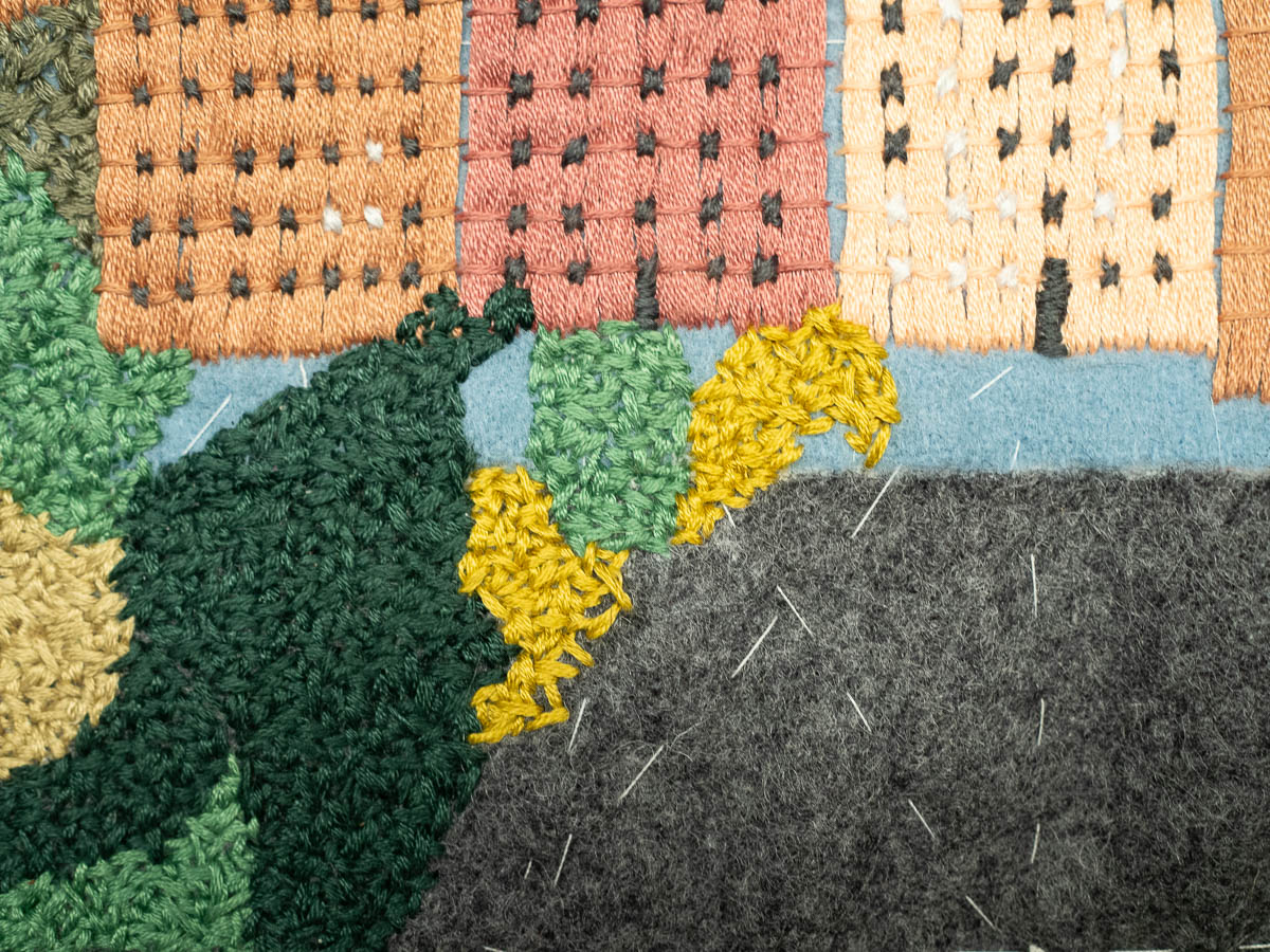 No more and no less. I want a predictable rhythm, and I don’t want to overdo it one day and then not want to pick up the work the next day. A HSL of DMC embroidery floss yields about 3 square centimetres of embroidered surface. I have about 90 cm2 of trees left, which will take me a month at this pace. Then I’ll have a few weeks to fill in the glimpses of street and car and railroad, and the dark reflections of the trees in the water. Those will both be less dense and far less monotonous than the trees and should hopefully go faster. (Original image here.)