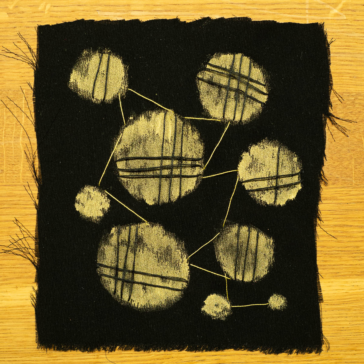 The dogma prompt: Black fabric. Fabric paint in the colour you used last week (which for me was orange). Make circles. Make straight stitches across the circles in black, and straight stitches between the circles in a colour matching the circles.