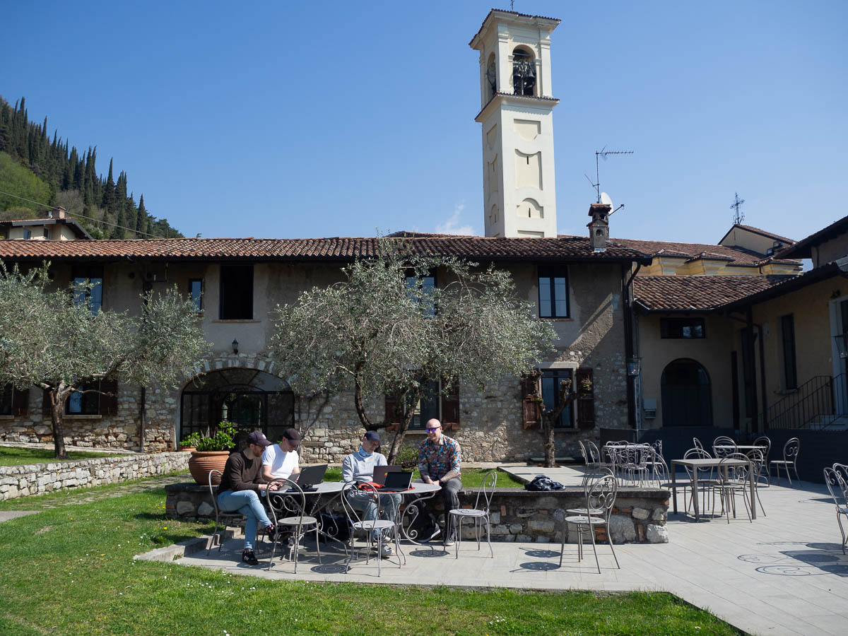 The morning was dedicated to knowledge activities, just like yesterday. A talk, and then coding together in small teams. The weather was pretty fabulous again and we could sit and code outside in the garden behind the castle, without layers of sweaters. There was even a power outlet hidden in the stone wall – as if this spot was made for developers.