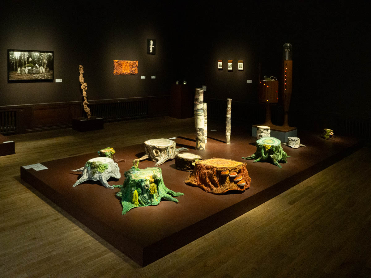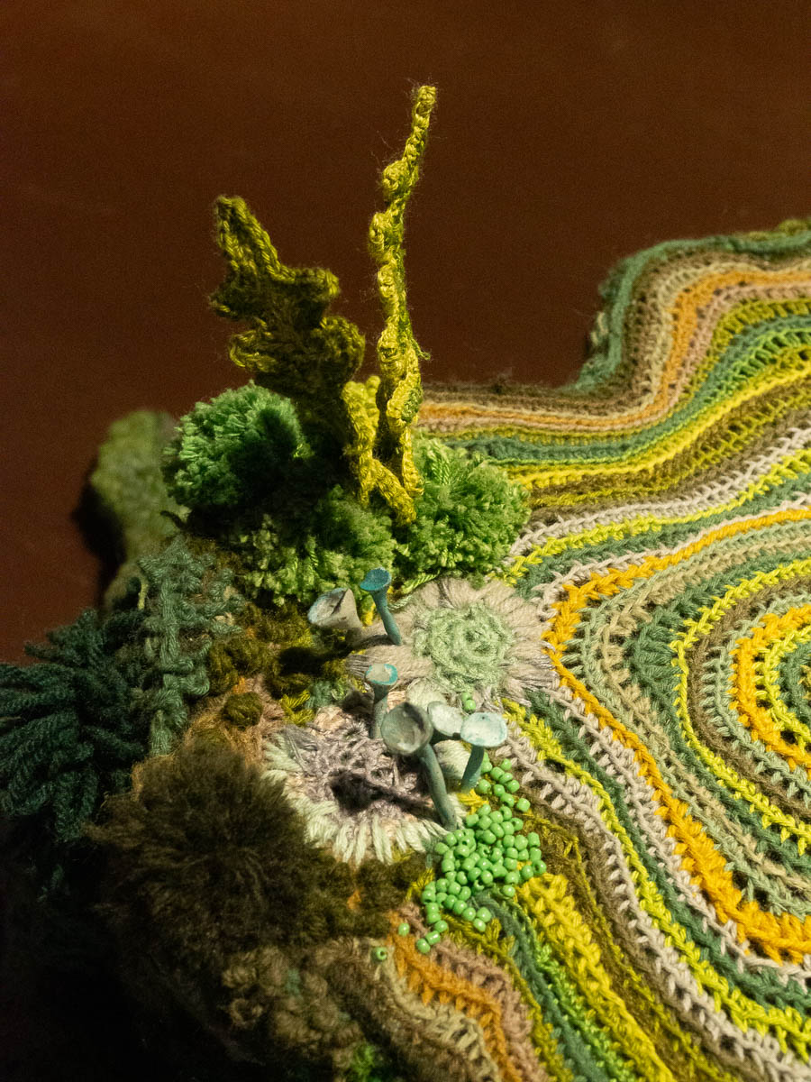 My absolute favourite was a set of crocheted tree stumps. Incredibly detailed, with creatively chosen materials and techniques to create tiny fungi, lichens, bracket fungi, etc. All very prettily and dramatically presented in a darkened room in brown earth tones.