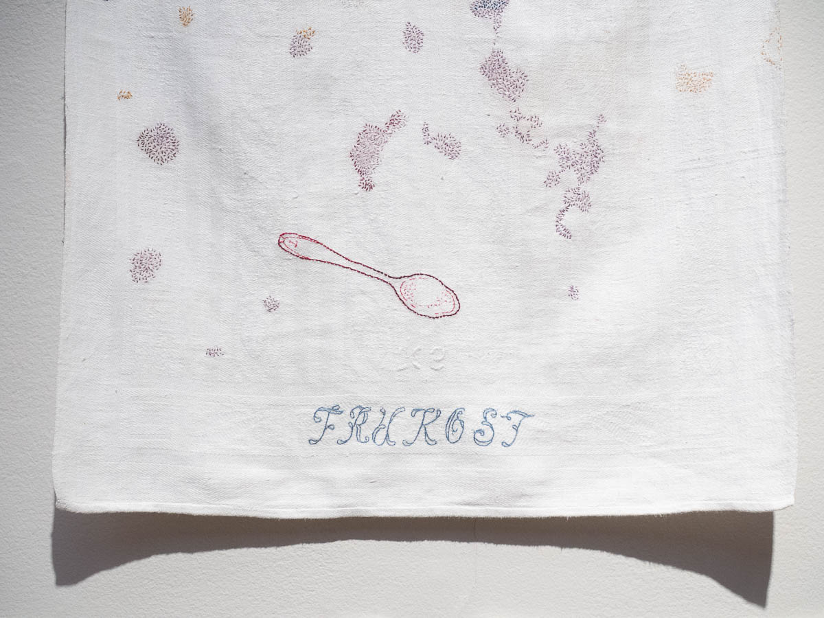 The embroidery on these kitchen towels is based on food stains left behind by the artist’s grandchild. A series of five pieces: breakfast, snack, lunch, snack, dinner.