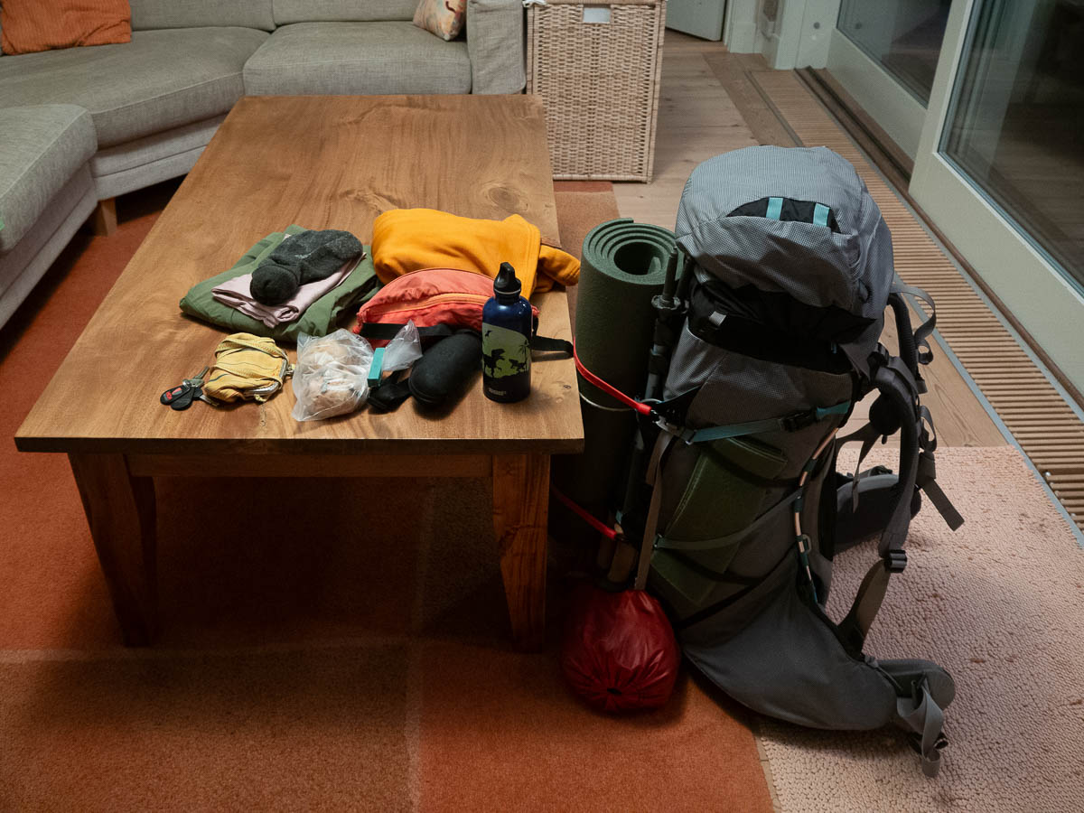 All packed for a four-day hike for the long weekend. Rucksack, clothes for tomorrow, water, breakfast rolls, camera, sunglasses.