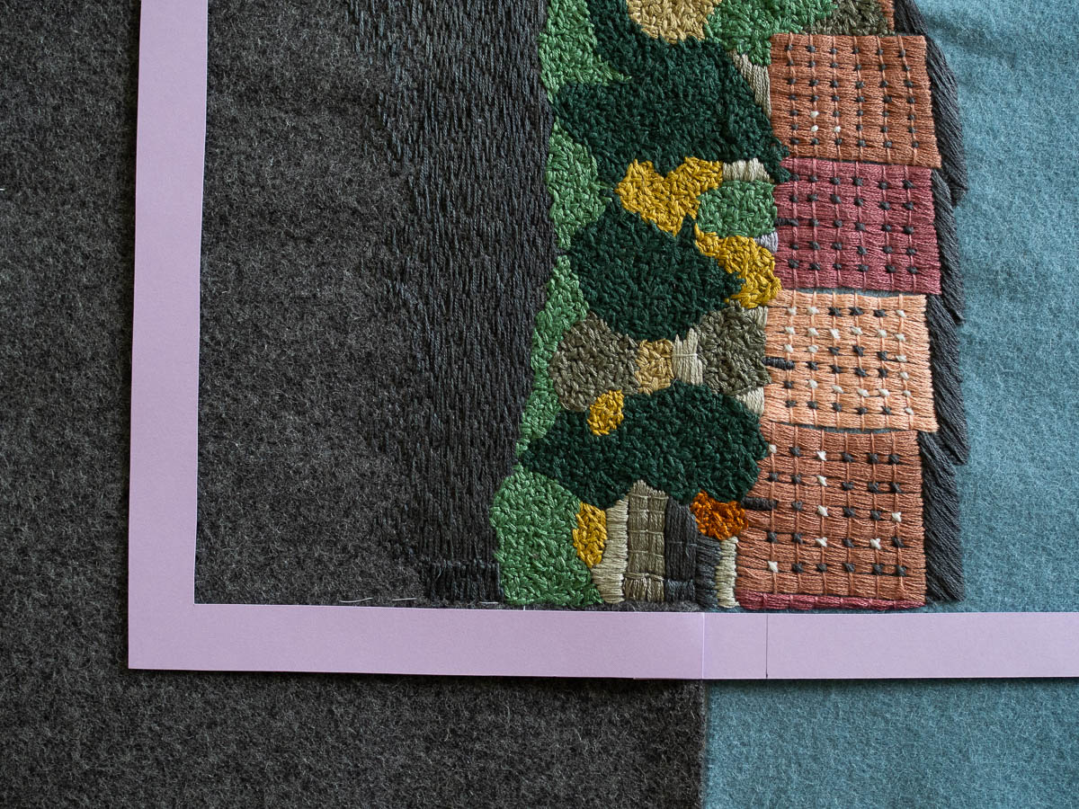 Step one: block and stretch the piece. It turns out that, even though I had a grid to work off, it’s somehow become slanted nevertheless. Fitting it into a rectangular frame like this would be difficult.