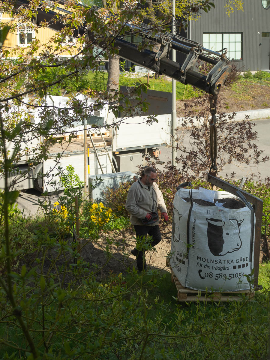 Nysse is keeping a close eye on the crane delivering 1 m3 of soil for the new planting area.