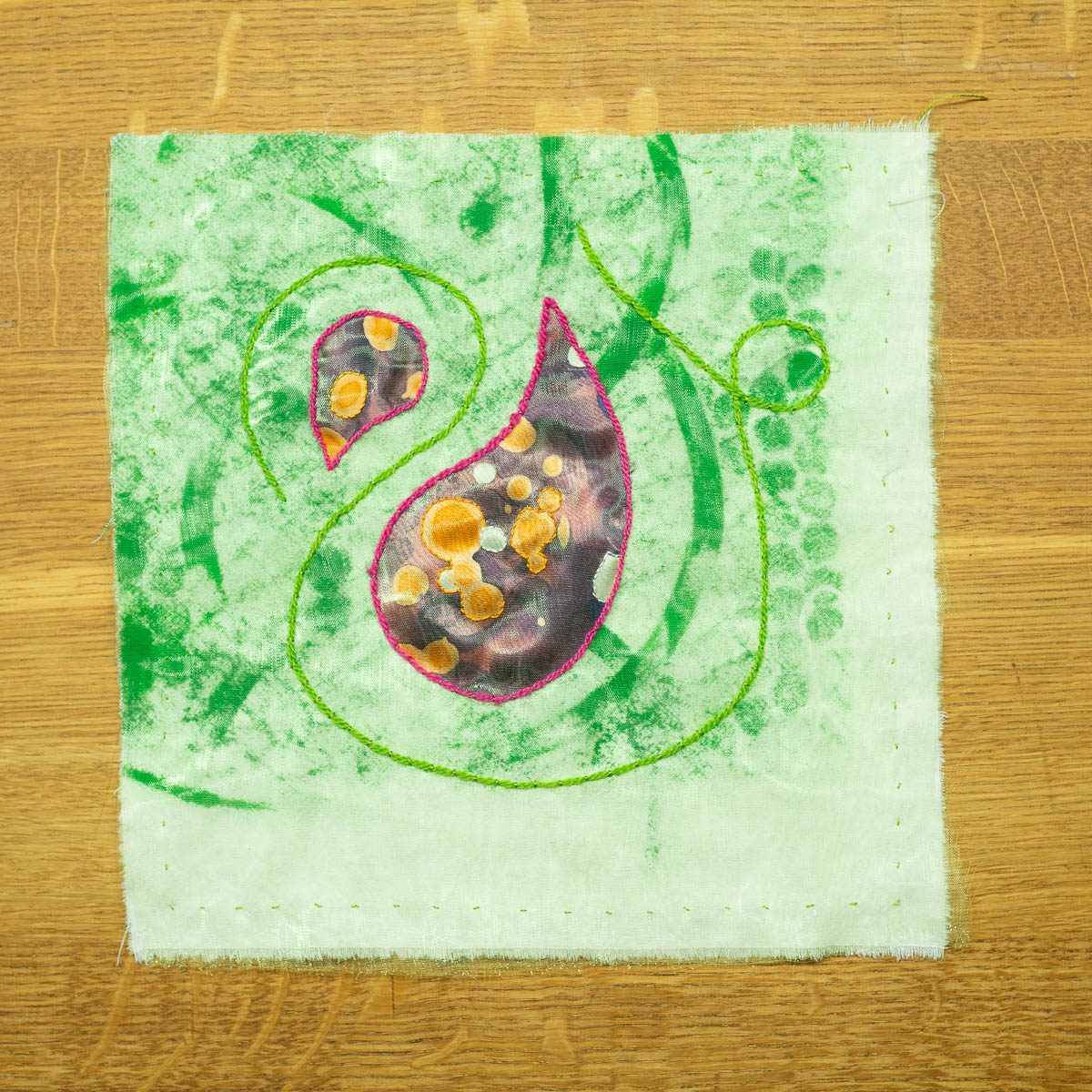 Sometimes the yarn or the fabric decides the details. When my hank of green thread ends, then that’s where the couching ends. When I want a piece of the silk fabric, if I have an existing scrap piece with roughly the right characteristics, then I take that, instead of imagining some sort of ideal and trying to find it in a larger piece – and the scrap piece can then set the tone for its surroundings.