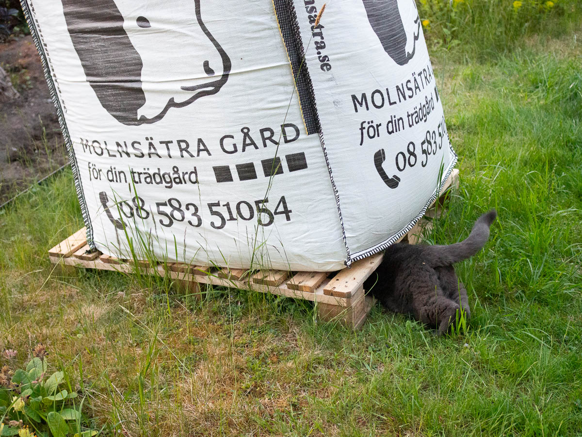 Nysse was obsessed with trying to get in under the pallet that the bag of soil was delivered on. Some small creature must be hiding under it.