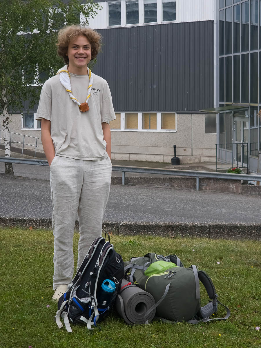Adrian is off to a week-long scout camp. The scouts gather in an industrial area near SpÄnga at a quarter past seven, get counted and checked off, and then picked up by buses. By lunchtime they will be at their camping grounds, which is at Kopparbo this year.