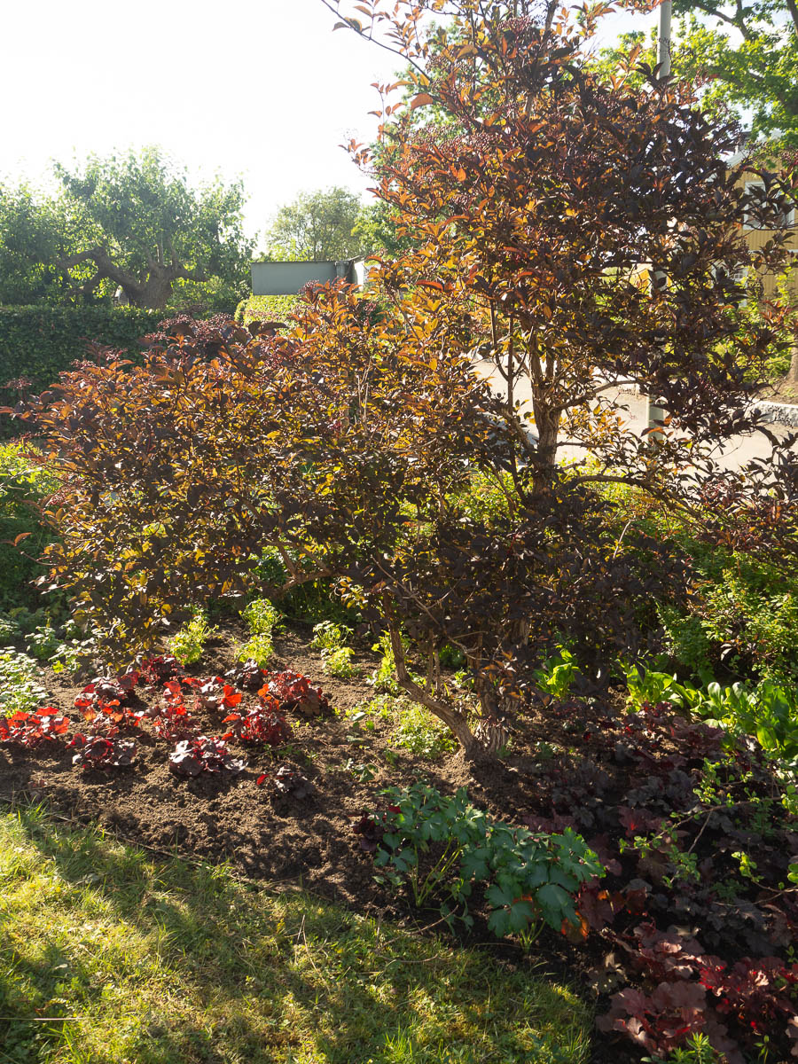 Many garden design sources suggest putting contrasting plants next to each other, but I chose to go with the complete opposite here. The dark leaves of the Heuchera match the elder, and I intentionally put them right under it. To me it feels like bits of the elder have fallen to the ground and taken root, or like a big red bush sheltering tiny red cousins under its wings.