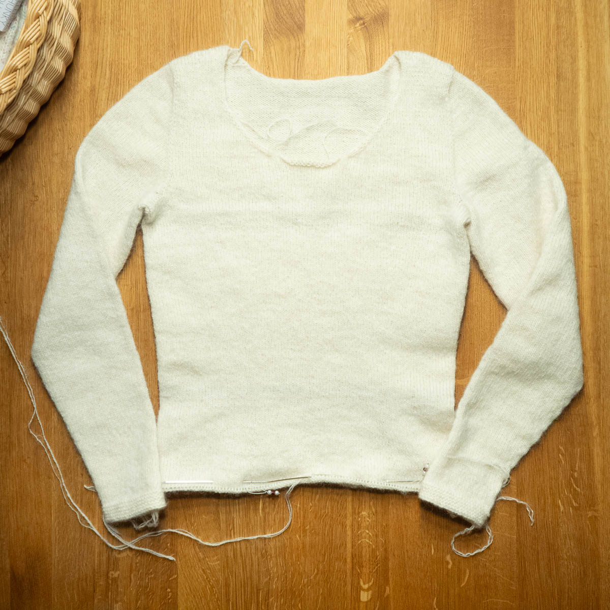 The thing that usually happens when I try something on, happened now as well. It wasn’t quite the way I wanted, so I ripped up a good 10 centimetres. I wanted it to fit very closely around the torso and then flare somewhere around the lower hips, but that didn’t work out. The fabric is somewhat stiff, even with the added silk mohair, so instead of stretching around the body, it rode up and bunched at the waist. It may be that the weight of the skirt would pull it straight, but also maybe not, so it’s not something I want to bet on. Rip up and redo with more width around the hips so that the fabric can hang and drape nicely.