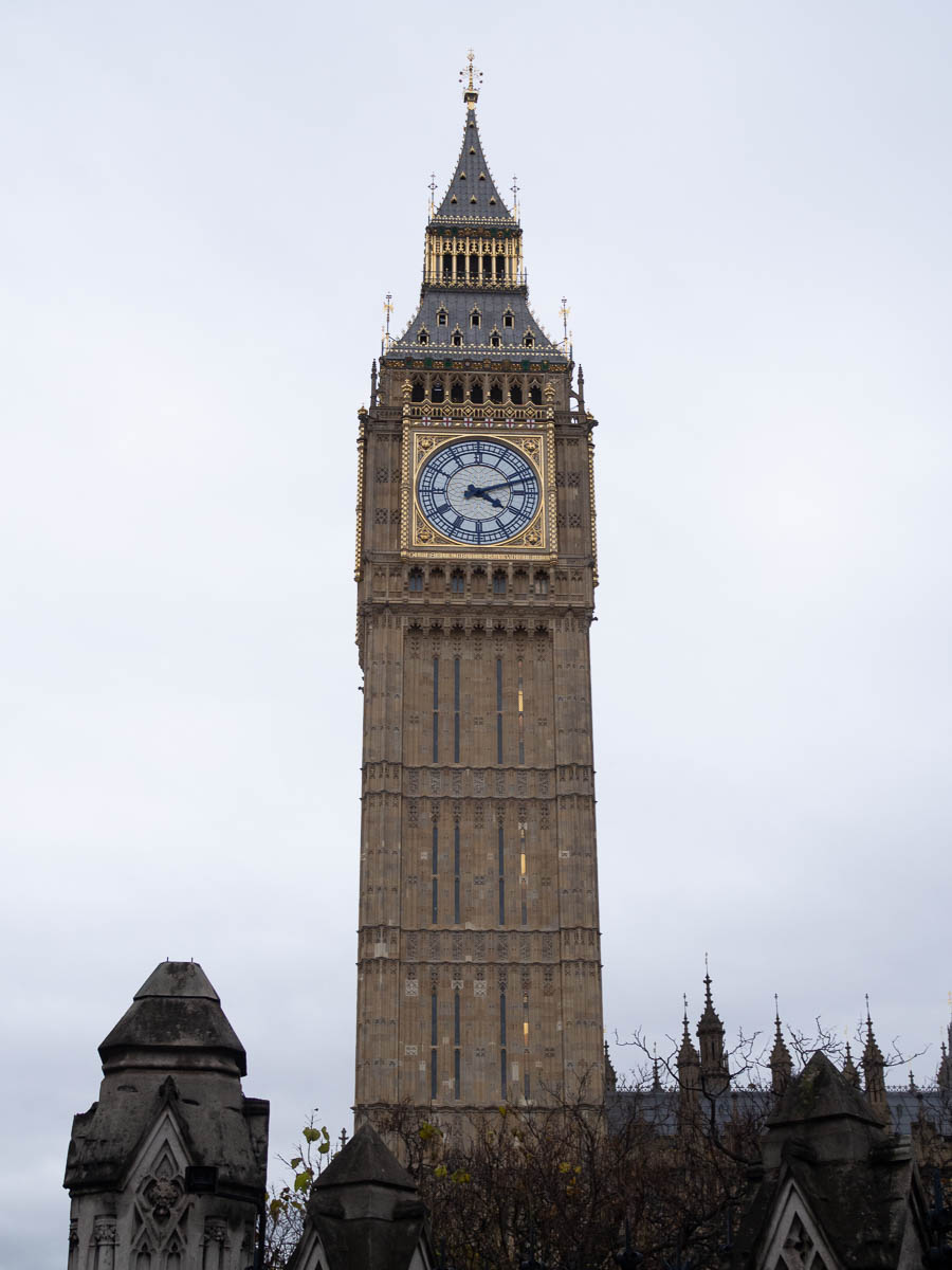 Saw Big Ben and Westminster Abbey; walked past Whitehall and a guard change, then onwards through St James Park. Debated whether the large white birds we saw in the distance were really pelicans, which seemed unlikely. Adrian argued that they were swans, but the shape was all wrong. It was getting dim and the birds weren’t posing very well, but Google confirmed that there are indeed pelicans in St James Park.