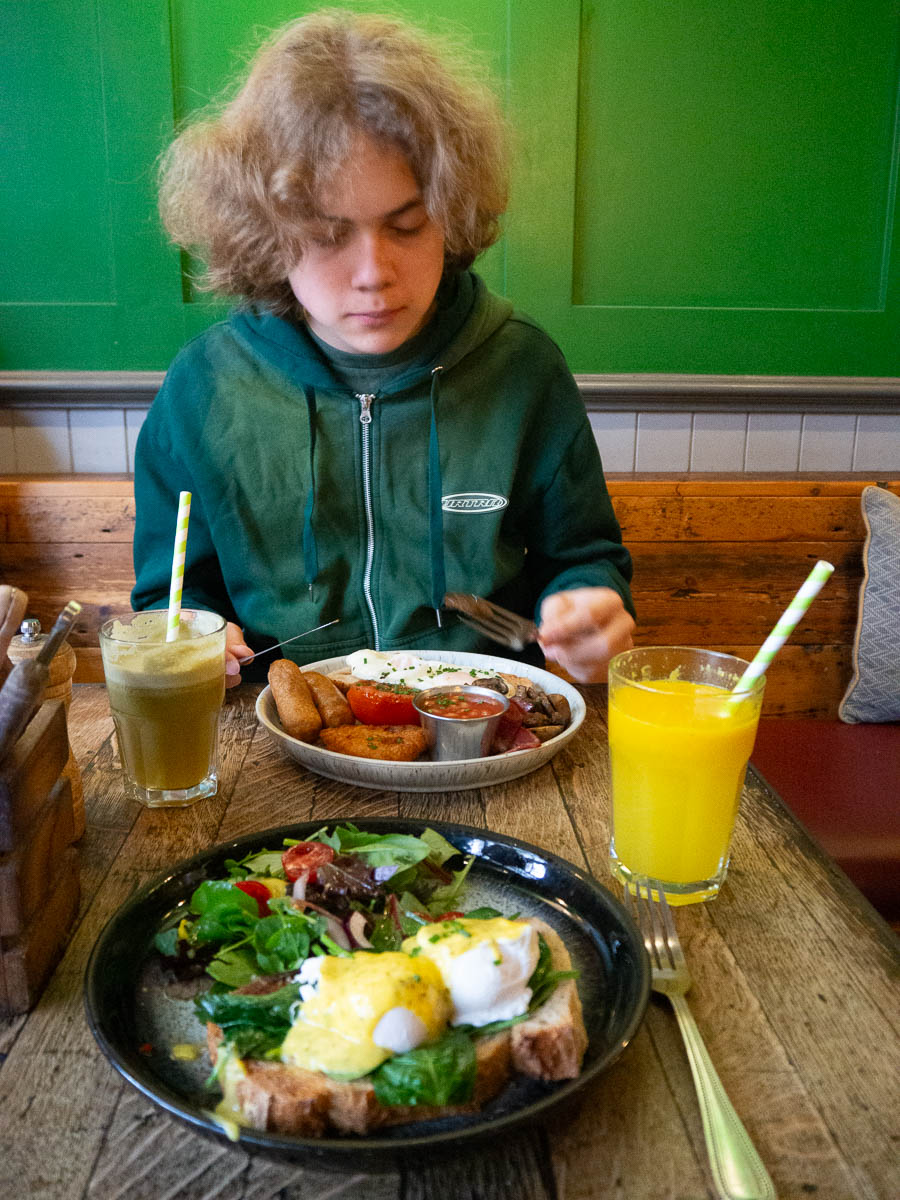 I am not interested in any part of an English breakfast, really, so I had Eggs Florentine – I like poached eggs but never quite managed to get the hang of making, so whenever we have brunch at a restaurant (which happens maybe once or twice a year) I let them make me poached eggs.