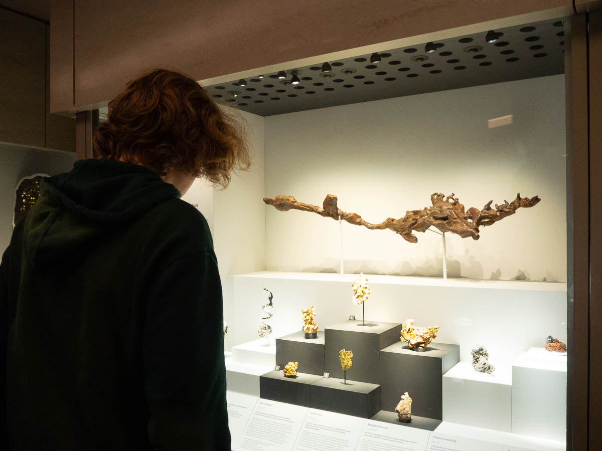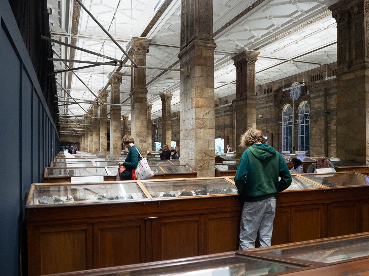 I would have expected Adrian to want to see more skeletons and such, but he opted for geology. I don’t know if I’ve ever visited the crystals and minerals hall of the NHM. It was astoundingly expansive. Several metres of sulphur in various shapes, case after case of copper-base minerals… Crystals, gemstones, natural chunks of pure metallic gold, you name it.