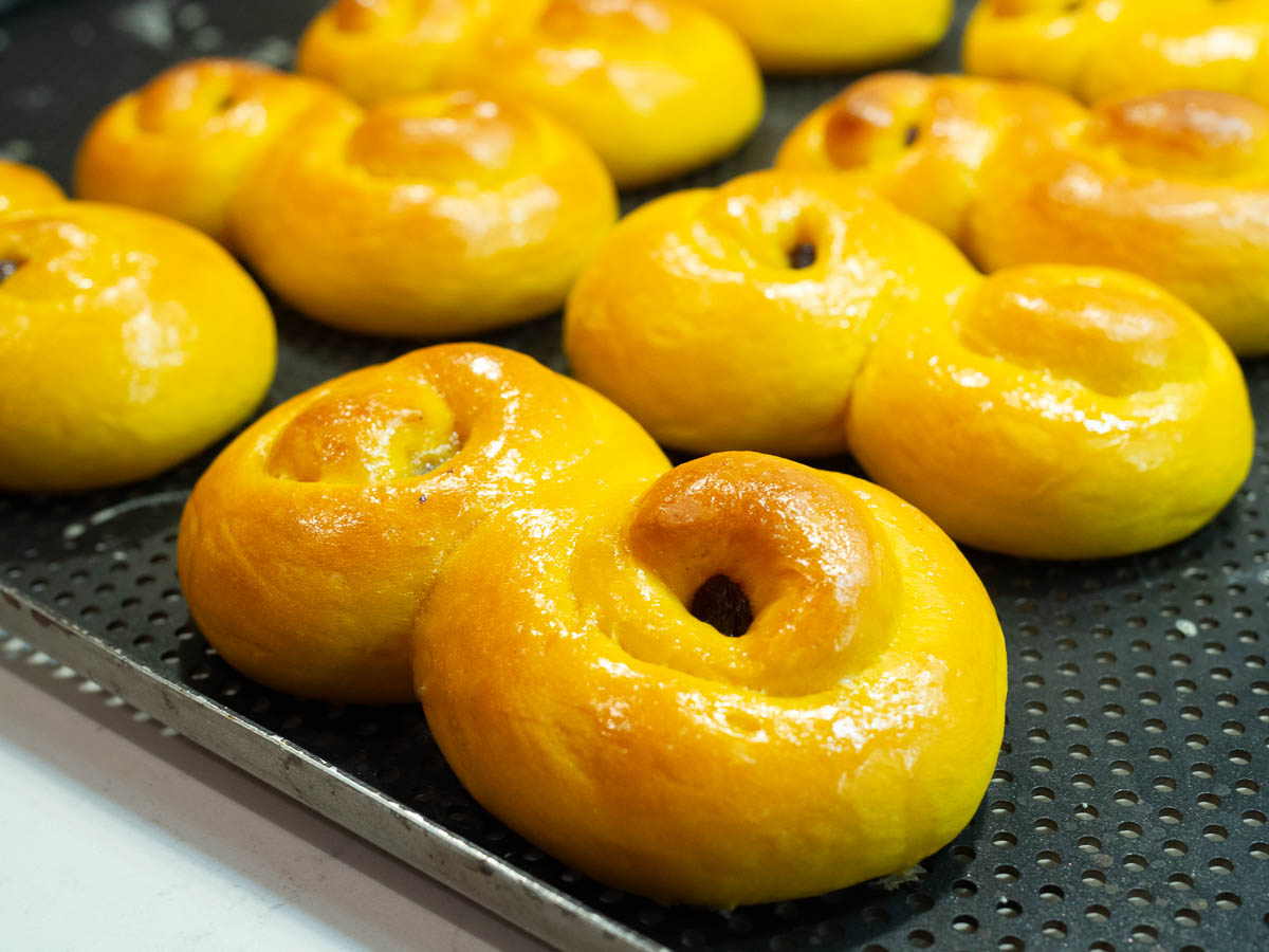 The lussebullar we made based on an online recipe described as “the ultimate”, with 294 votes (averaging at 4.5 stars) and 174 gushingly positive comments. There were no special ingredients involved – just preparation, and attention to detail. It starts with a pre-ferment the night before, has you soak both the saffron and the raisins (separately) etc.