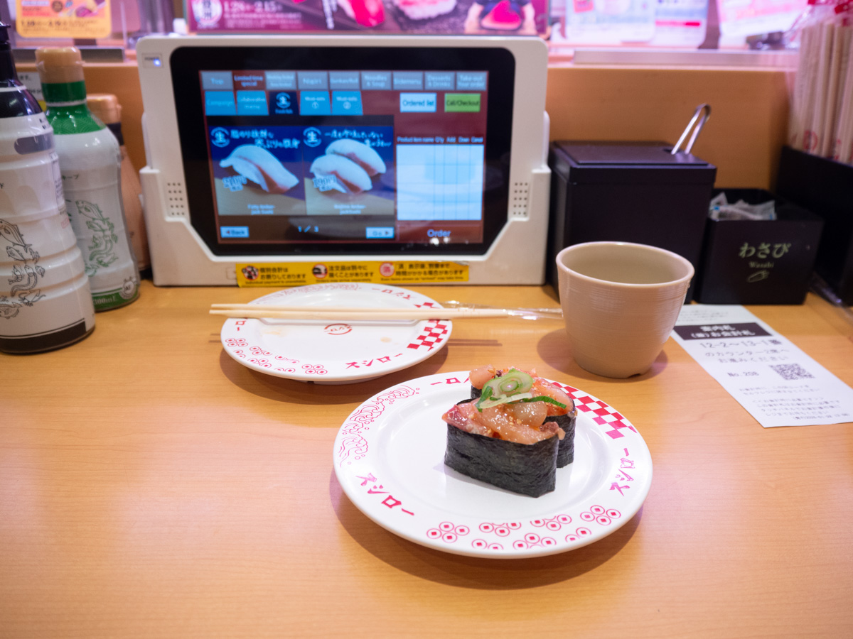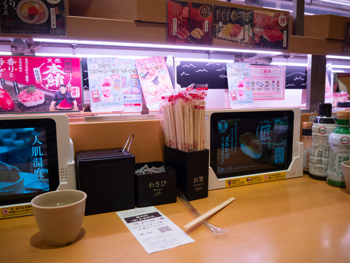In Tokyo, it’s all individual and customized and computerized. There’s a tablet at each table with an incredibly long menu of sushi, sashimi, side orders, desserts etc. Tap and order, and a few minutes later, your plate arrives on the belt and stops in front of you.