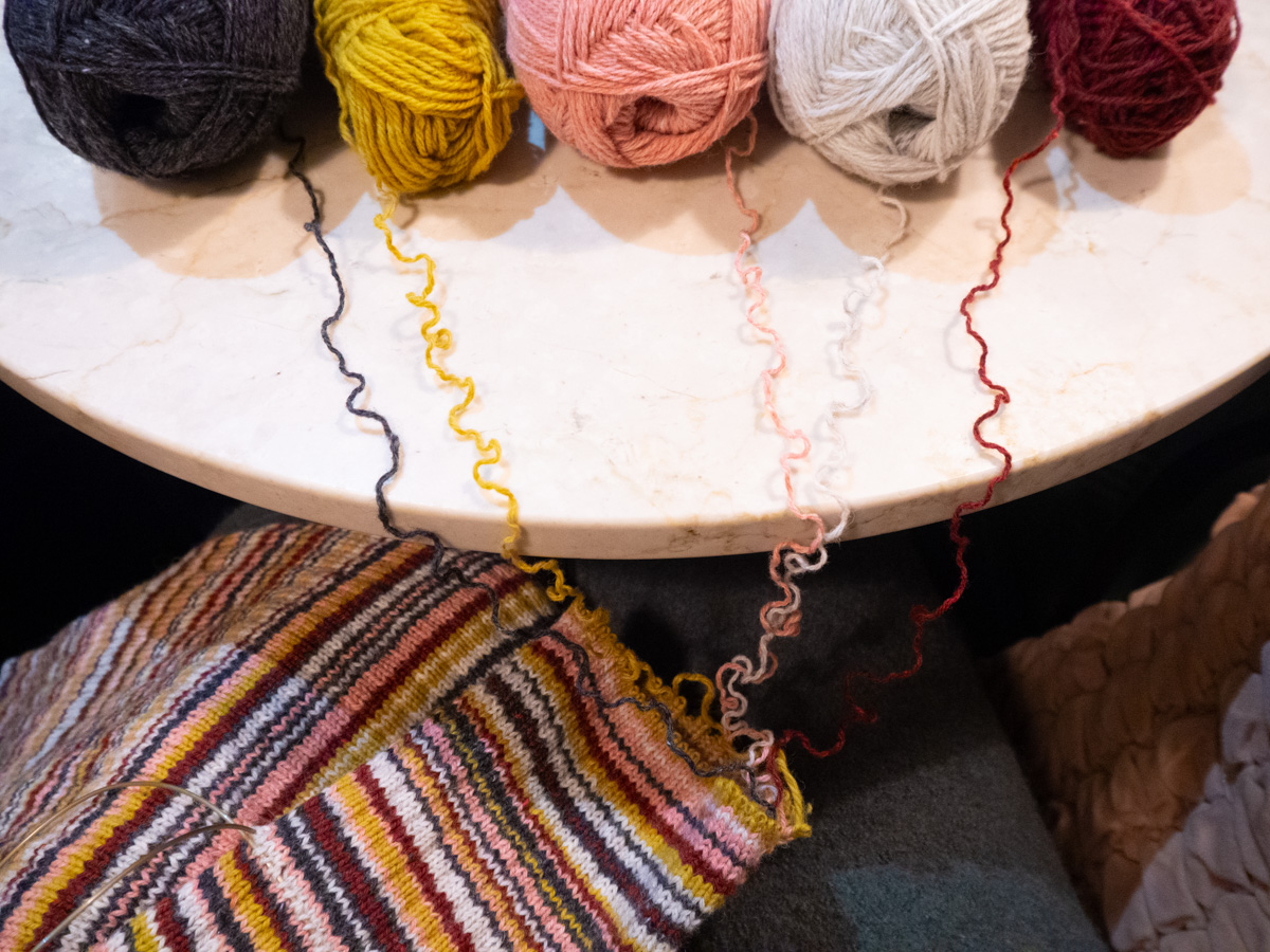 For today’s knitting club meet-up, I packed the sweater and no other project, so I’d have no choice but to bite the bullet. Ripping back the stripes was exactly as finicky and slow as I had expected it to be. So much yarn management: rip back one row at a time, wind it up, carefully shuffle the balls around to keep them from tangling. But with company around me, it wasn’t as tedious as it would have been otherwise. I got it all done and actually got as far as knitting a few rows at the end. (With decreases!)