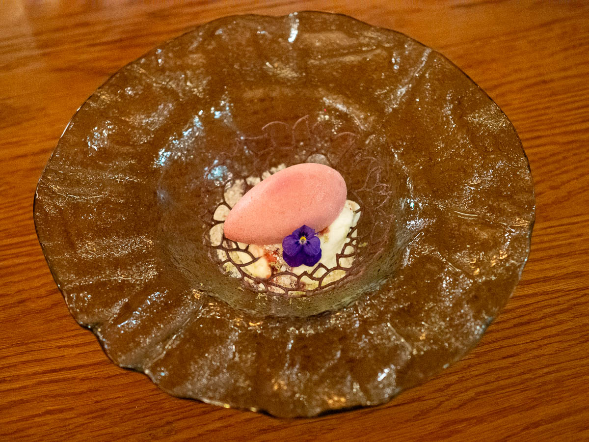 My dessert was a bit of a disappointment. Titled “Cherry and lime”, it led me to expect an explosion of flavours. But the cherry sorbet(?) barely tasted of cherry, and the fluffy, creamy lime was also very delicate in flavour. Not bad, per se, but after eating sushi with wasabi and soy sauce, this felt very tame.