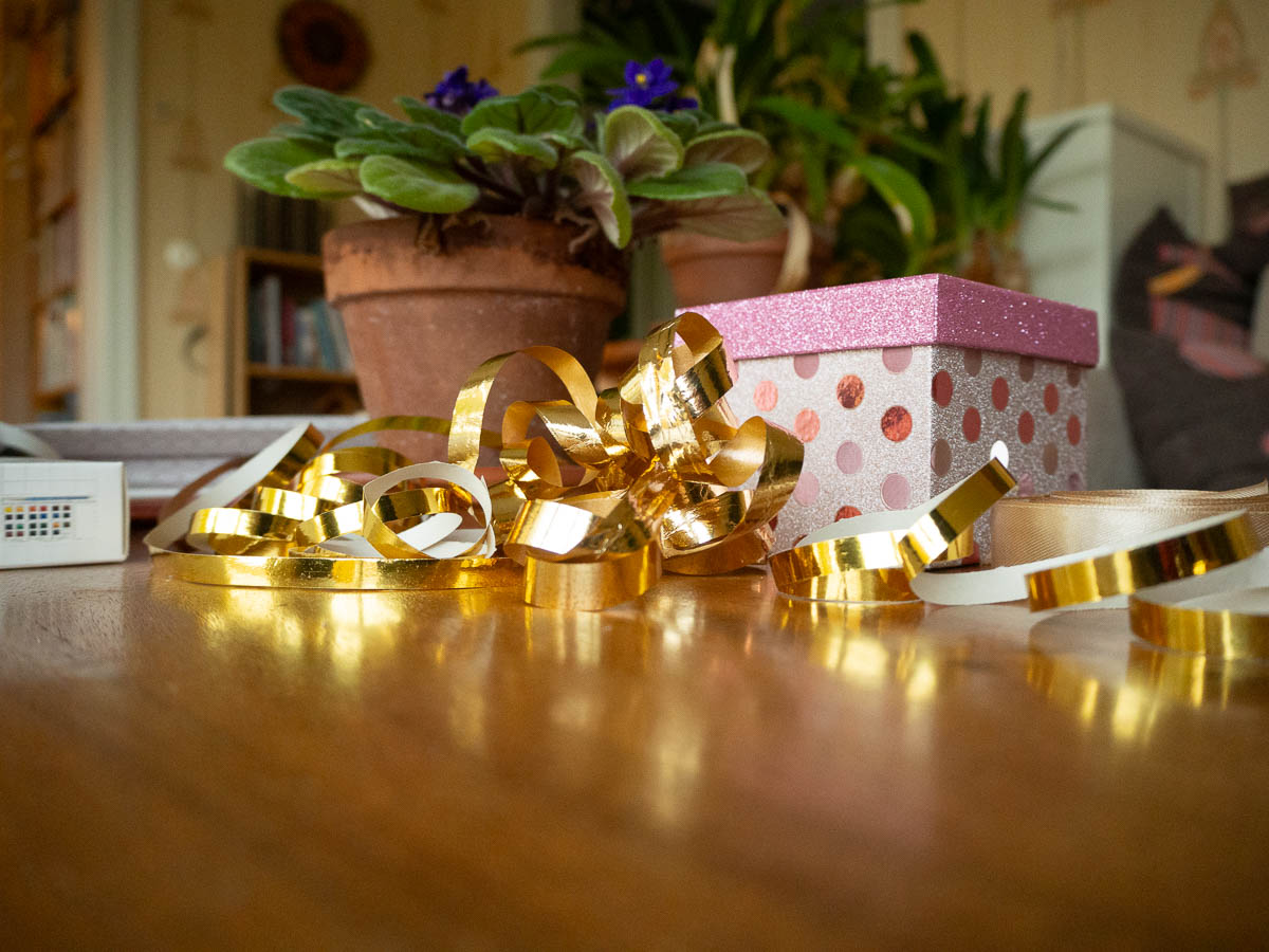 Knowing Nysse and his habit of attacking wrapped-up gifts, with all their play-friendly paper and ribbons and shiny bits, we didn’t leave the gifts out overnight. But when he’d had his breakfast and gone out, we put the gifts under the tree. He managed to attack one of them – luckily the one where the inner layer was a sturdy cardboard tube, and thus hard to damage and easy to re-wrap – but after that I kept my eye on him all the time and chased him away twice, after which he was almost afraid of even going near the tree, so there was no more damage.