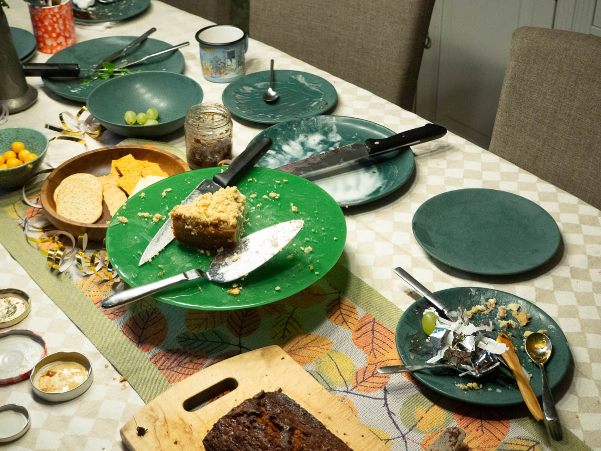The party preparations started several days ago, with three cakes baked over three days. We had an apple-pie cheesecake (Ingrid), a banana and chocolate cake (Adrian) and an almond cherry pie (Eric).