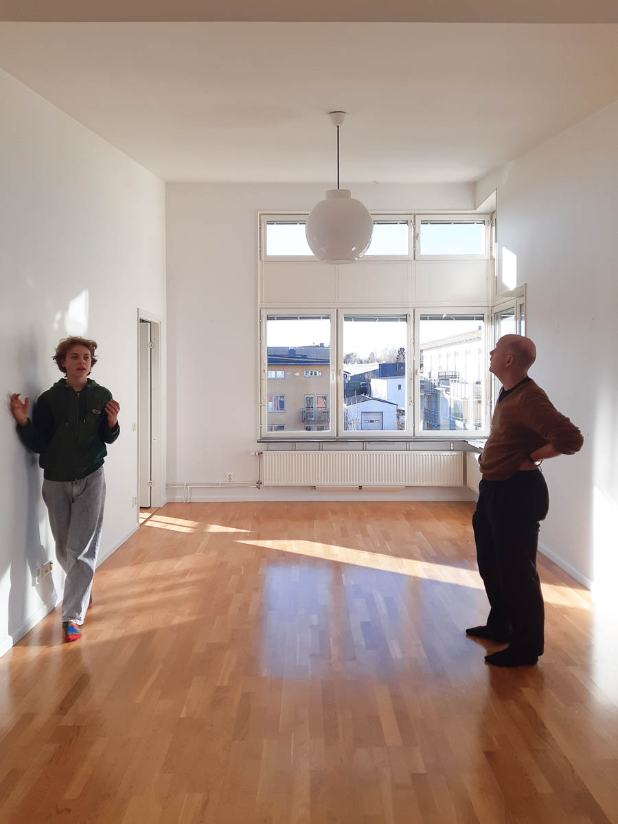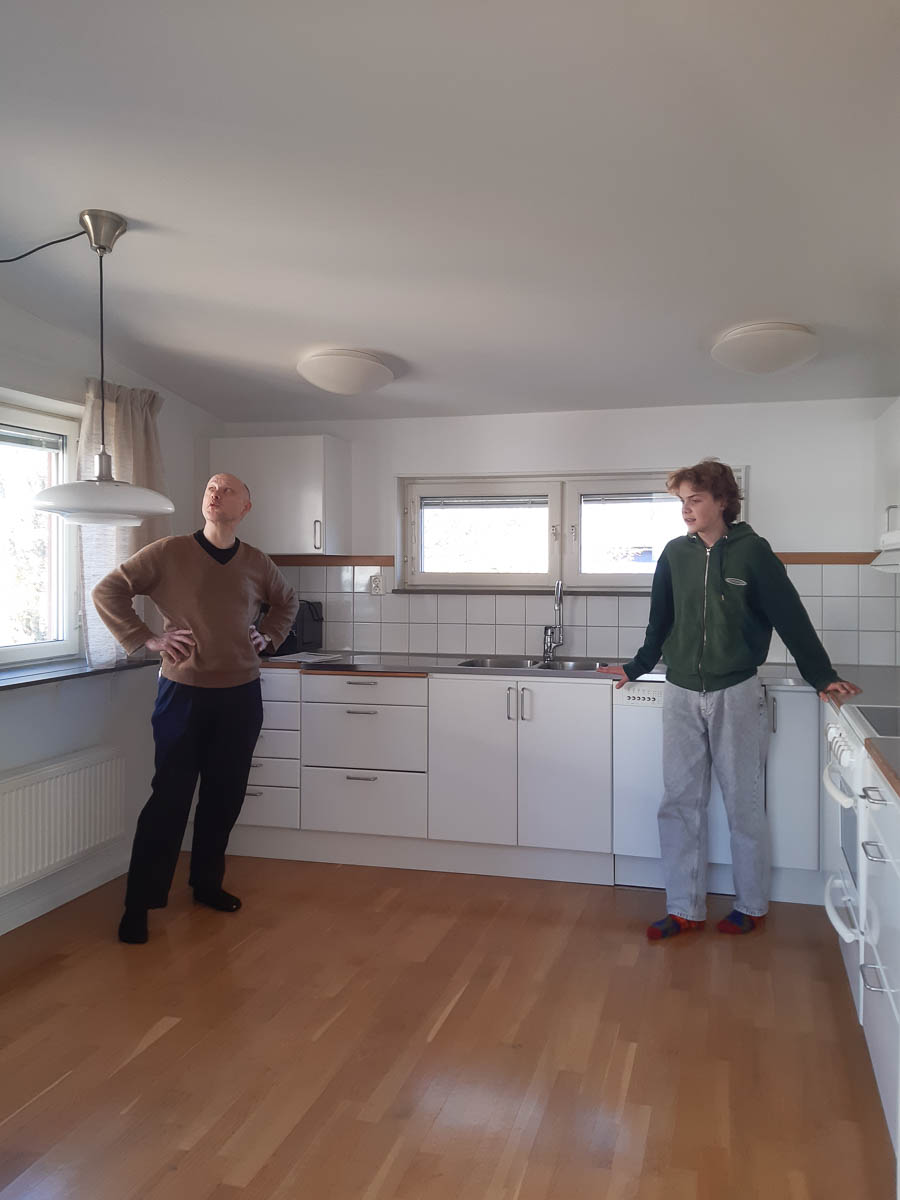 Eric and Adrian are planning out who gets what room, how to furnish the living room, and what will go where in the kitchen.