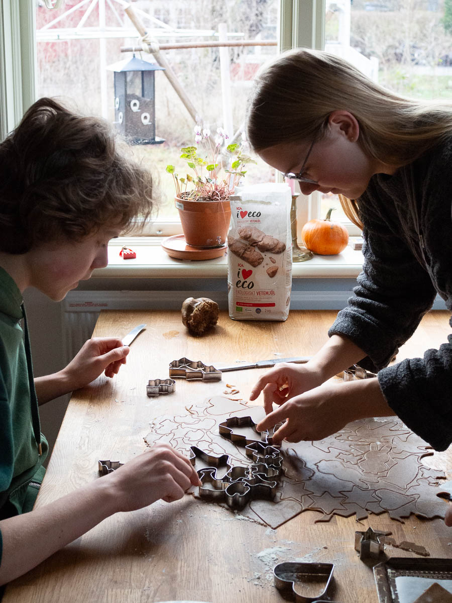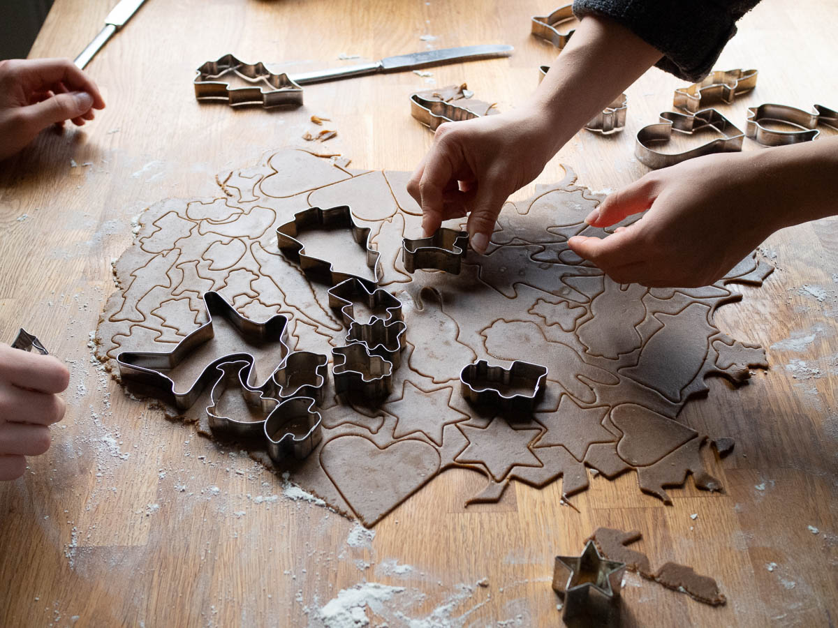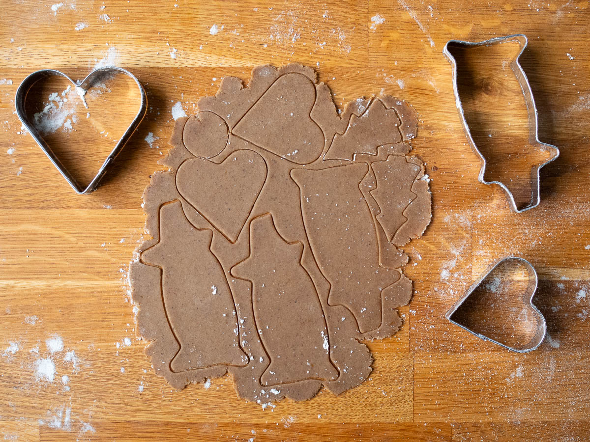 Every year we tell ourselves that we will only bring out the most important cutters and that there is no need to dirty all of them. Our priorities overlap but only partially, and we end up using at least two thirds of all the cutters anyway. I like the traditional shapes, Ingrid wants the ones that are good for decorating, Adrian prefers the small ones that are best at using up the most dough. Eric is happy to just bake whatever we cut.