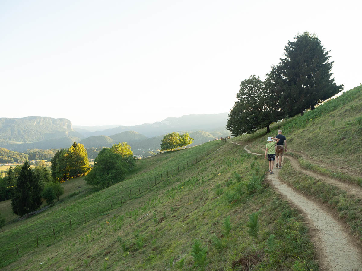 Today we wanted to take in the sights of Bled. The weather forecast promised clear skies in the morning but rain and thunder for the afternoon, so we went for a walk along the lake shore towards viewing points on hills at its western edge. Lake Bled also has a little island which you can visit either with a kayak or a SUP board, or you can get someone to row you there in a gondola.