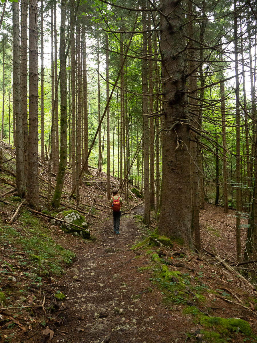 The actual ascent was just over 700 metres. Which is still a lot, especially on a hot, sunny day! And the route up this mountain was steep and unrelenting. Up, up, up, constantly, with barely any breaks in the ascent, or even a zig-zag. The first half of the ascent was also quite boring – for a big chunk of the lower parts, we followed a dusty trail through through a monotonous spruce forest. I don’t even have any photos from that part.