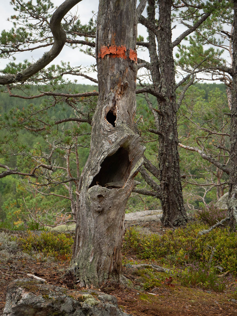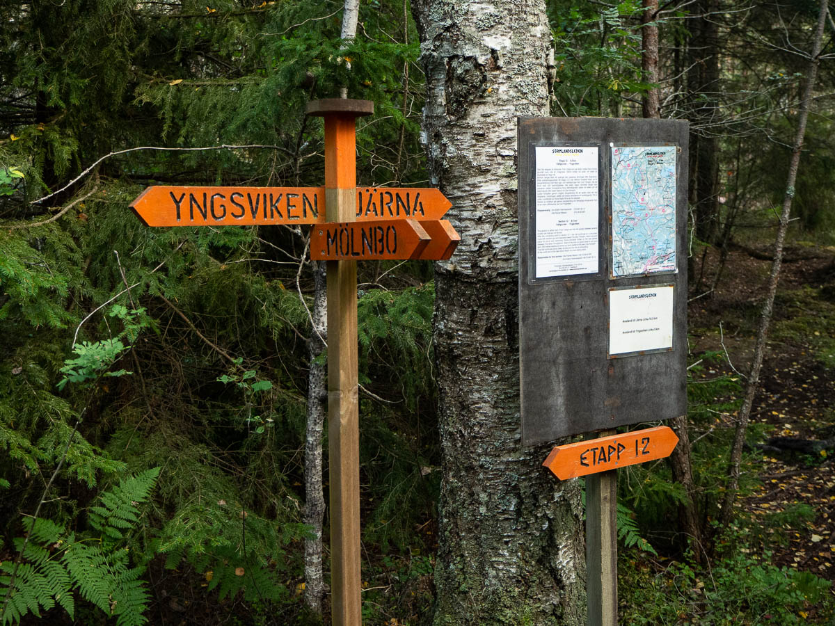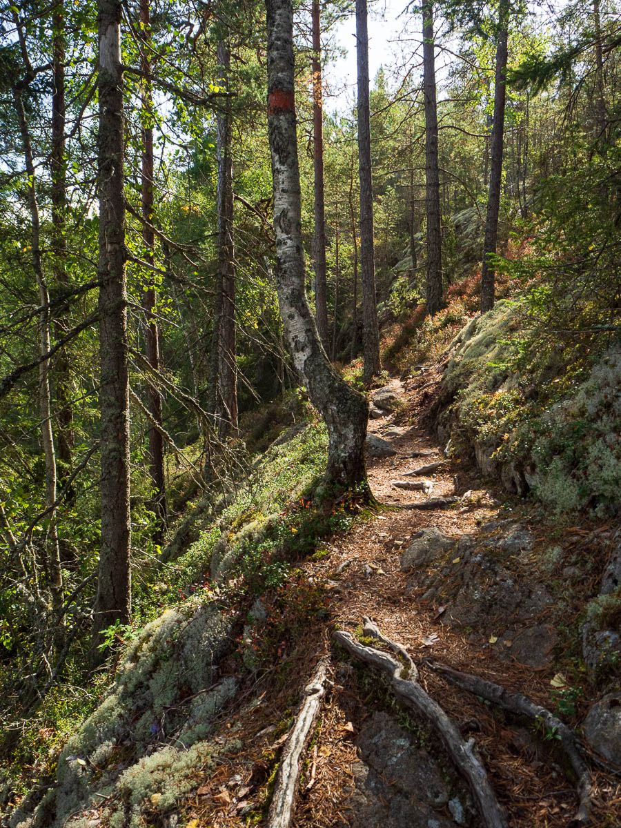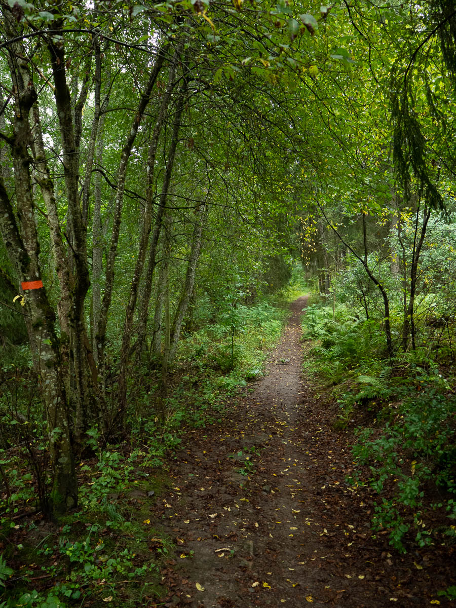 At the beginning and end of the trail, near Skottvång, there were numerous works of art in the forest along the trail – odd constructions, plastic plants in unexpected places, funny road signs (pointing towards “tree”, “path”, “air”, “water”, “berries” etc), coffee cups hanging on trees, a modern rune stone, etc.