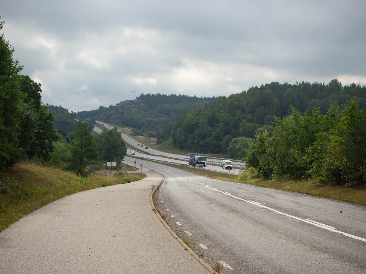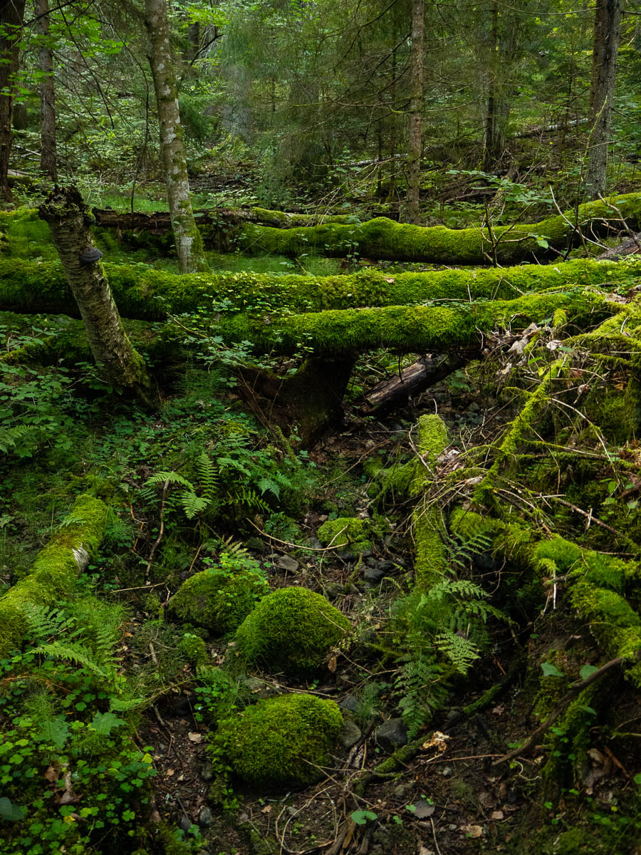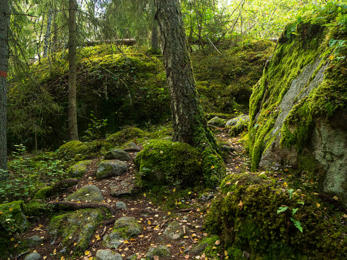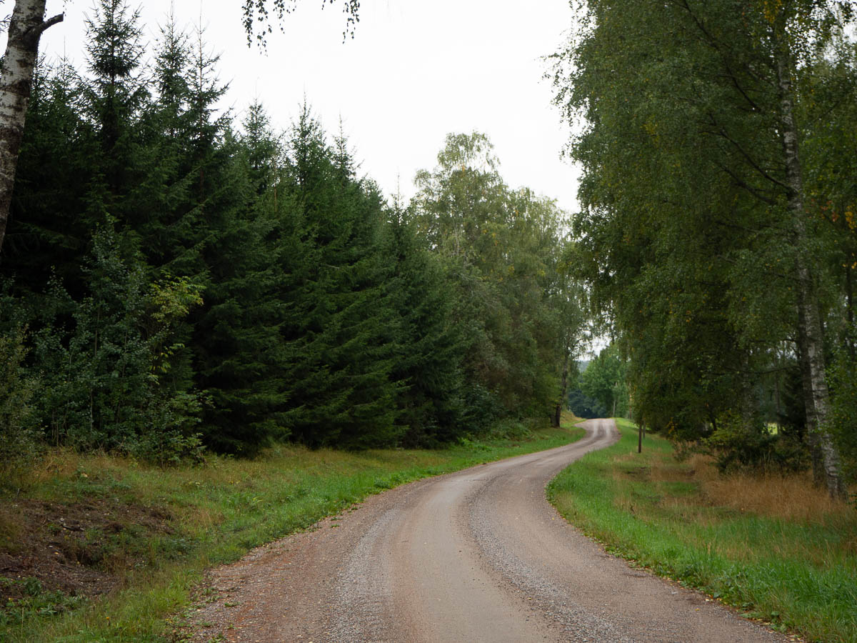 At the beginning and end of the trail, near Skottvång, there were numerous works of art in the forest along the trail – odd constructions, plastic plants in unexpected places, funny road signs (pointing towards “tree”, “path”, “air”, “water”, “berries” etc), coffee cups hanging on trees, a modern rune stone, etc.