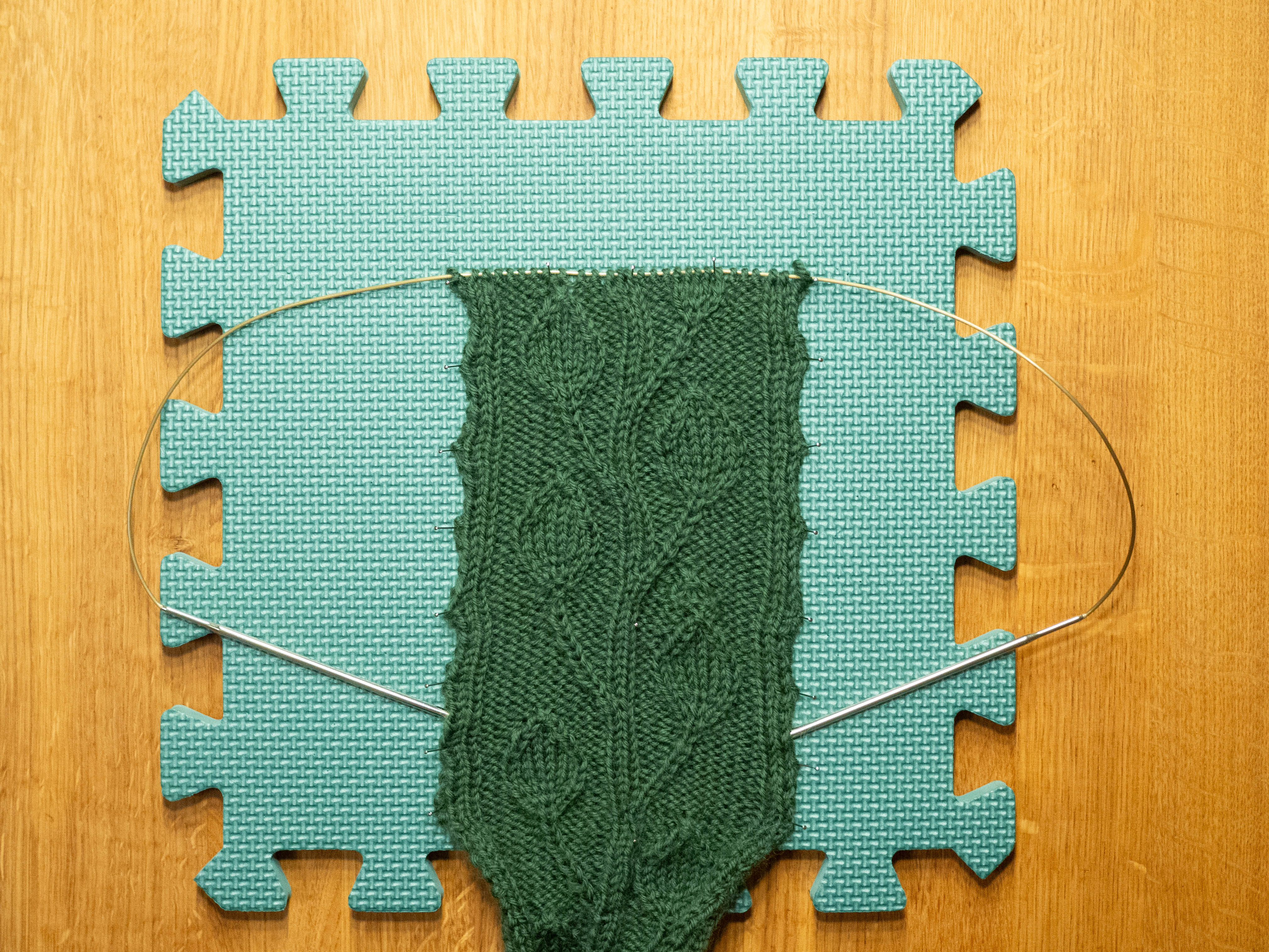 The vine on the other hand needs more work. It’s a stick, not a vine; way too straight. I made several pen-and-paper attempts at making it curve – increase somewhere on one side while decreasing on the other – but couldn’t get it to work. Whenever I adjusted one part, it threw something else out of whack. The stem wouldn’t reach the leaf at the right row, or there wasn’t anywhere to put a decrease without distorting the entire panel.