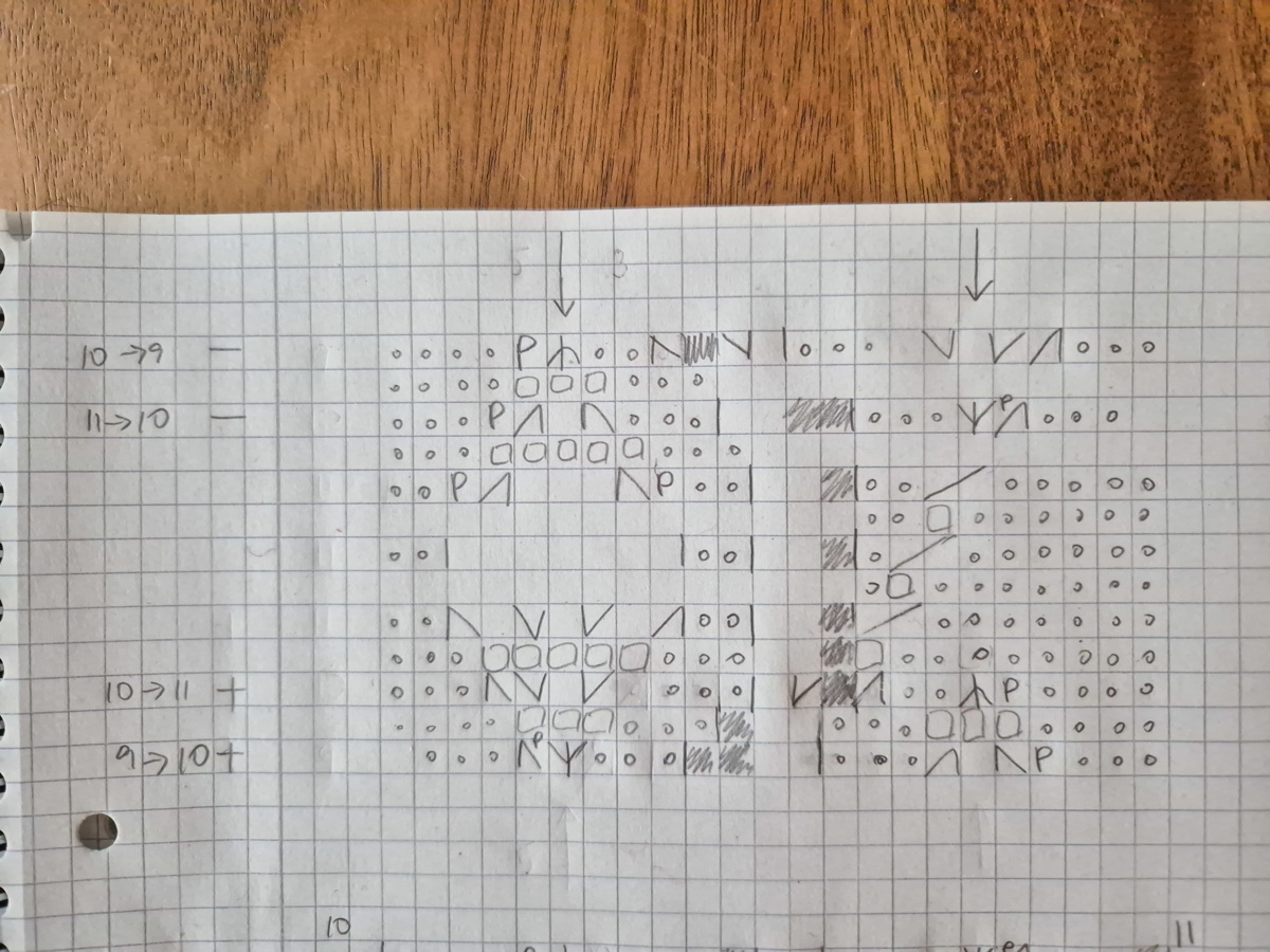 With lots of trial and error – mostly with pencil and eraser on graph paper, and a few attempts with actual yarn – I feel like I’m 90% there. It would all look smoother and tidier if I wet blocked the knit fabric but I don’t even need that now, I just want to see the shapes.