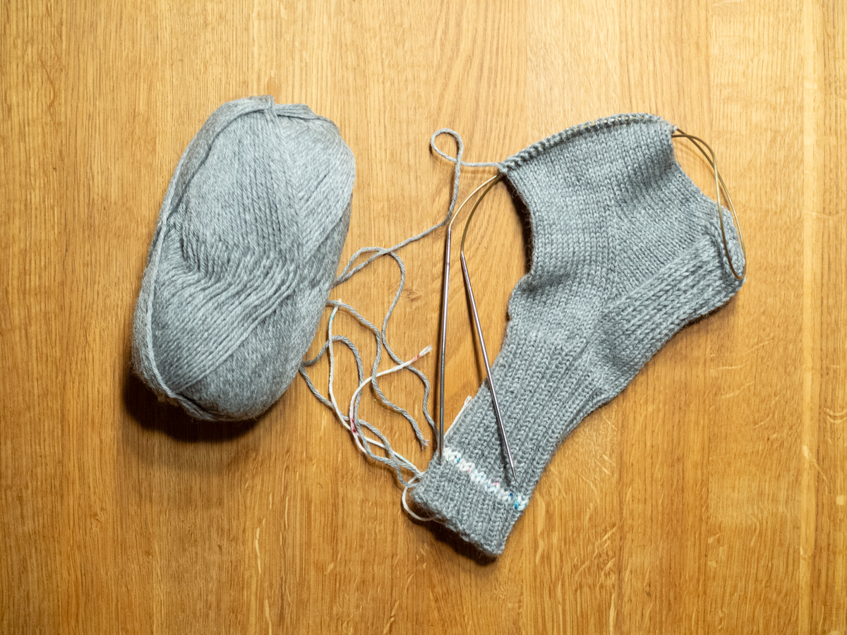 This is my second attempt of the first sock. The label on the yarn suggested using 3 mm needles. The fabric came out way too drapey and floppy with those. Could have worked for a cardigan or something, I guess, but it was absolutely not right for socks. This is a sock yarn, both by fibre content and by name. Why would they suggest a needle size that won’t work for knitting actual socks? Argh.