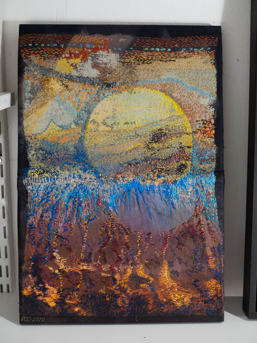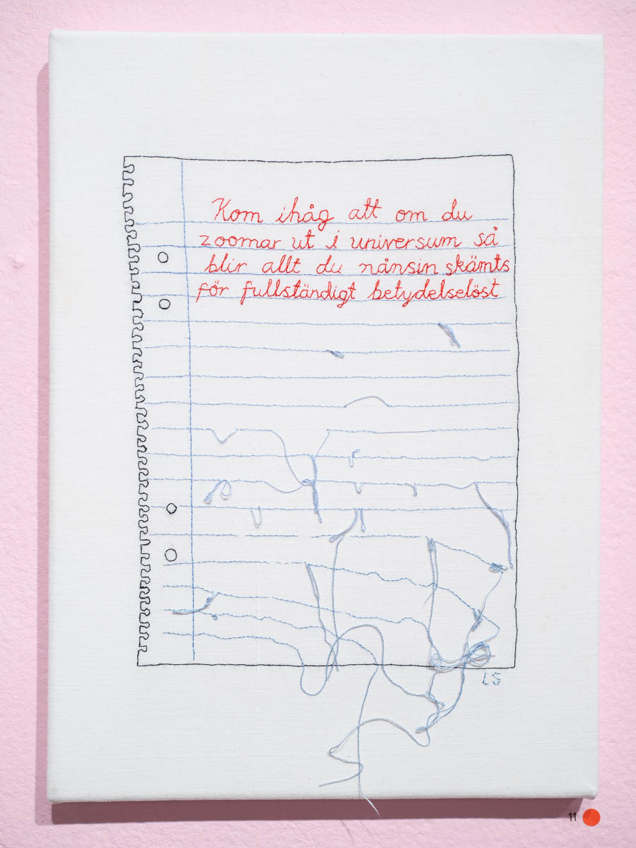I follow her on Instagram and mostly knew what to expect, but was still surprised. I had gotten a rather misleading impression of how large her embroideries were, based on the size of the stitches in them. What I thought was sewing thread or maybe one strand of embroidery floss, was instead silk organzine, apparently the thinnest thread manufactured. (Since today was the opening day of the exhibit, Lotta Sjöberg was present herself, and I took the opportunity to ask questions.)